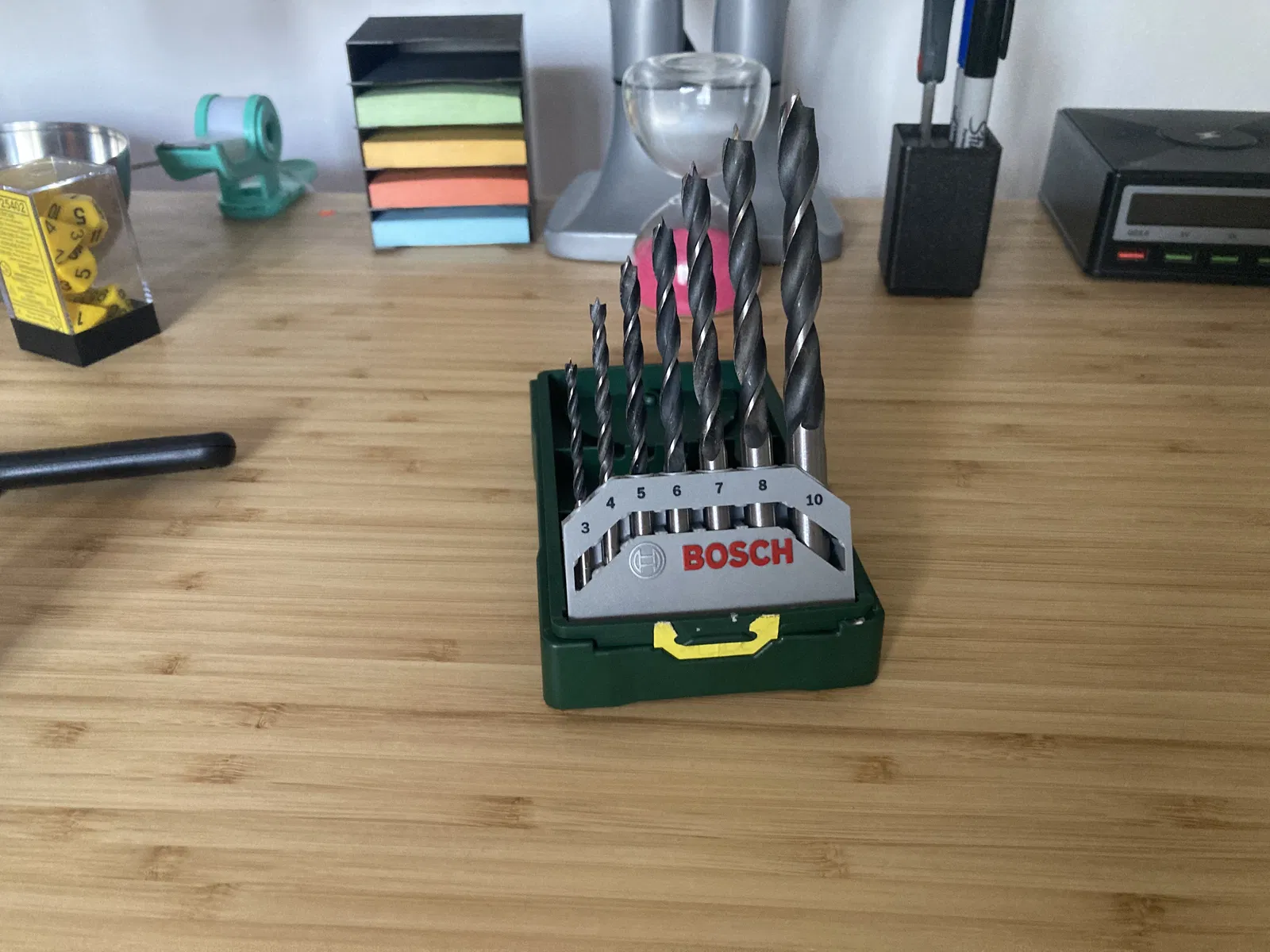 Kệ đựng mũi khoan gỗ này ban đầu được thiết kế để vừa với bộ mũi khoan gỗ 7 món của Bosch. Có lỗ gắn nam châm và lỗ bắt vít. Tui in bằng PLA xanh, đầu phun 0.8, infill 10% và tolerance 0.5mm, xài ngon lành luôn.