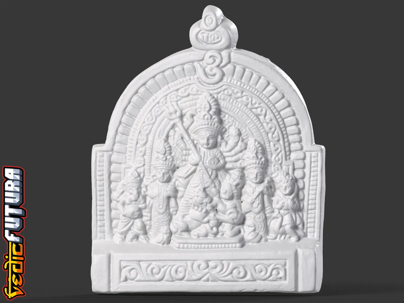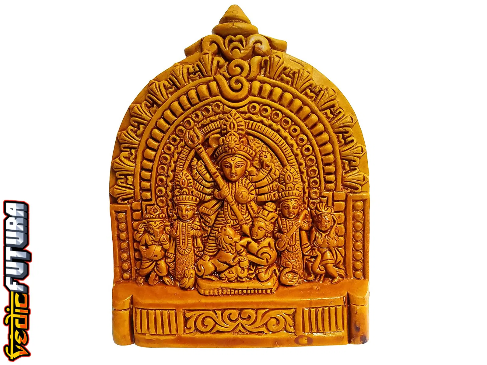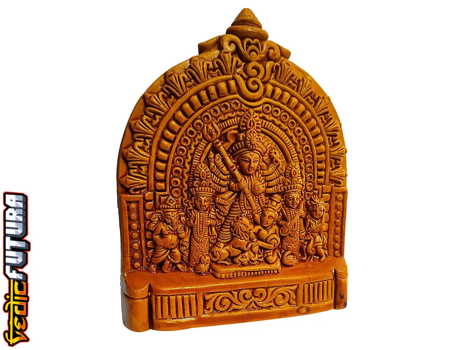 Truyền thuyết về Nữ thần Durga xoay quanh việc chiến đấu chống lại cái ác và các thế lực ma quỷ đe dọa hòa bình, sự thịnh vượng và chính pháp (dharma), tượng trưng cho sức mạnh của cái thiện chiến thắng cái ác. Nữ thần Durga, trên con sư tử của mình, đã xuất hiện trước Mahishasura, nơi con quỷ biến thành nhiều hình dạng khác nhau và tấn công nữ thần. Mỗi lần như vậy, Durga đều tiêu diệt các hình dạng của hắn. Cuối cùng, Durga đã giết chết Mahishasura bằng cây đinh ba của mình khi hắn đang biến thành một con quỷ trâu. Ở hai bên rìa là thần Ganesha và thần Subramanya (còn gọi là Kartikeya) cưỡi trên con công. Với hóa thân này của mẹ mình là Parvati, các vị thần nhí này tượng trưng cho kiến thức và sức mạnh tương ứng. Có thể nhận ra bởi con thiên nga (sự thuần khiết) và con cú (sự khôn ngoan), tác phẩm đất nung được chế tác tinh xảo này được hai nữ thần tối cao Saraswati và Lakshmi hai bên. Cùng với Mẹ của các Vệ Đà, Nữ thần Saraswati và Nữ thần Thịnh vượng Lakshmi, ba vị này cùng nhau tạo thành điện thờ Hindu.