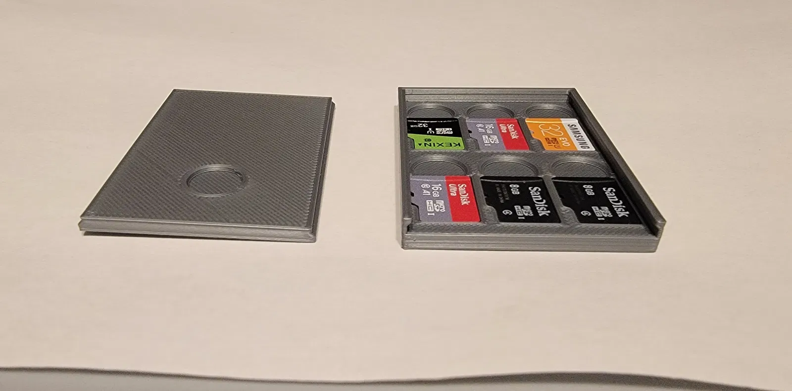 Hộp đựng thẻ Micro SD kèm nắp trượt, có thể chứa tới 6 thẻ. Được thiết kế với các thông số in cơ bản cho PLA, bao gồm độ cao lớp 0.2mm và đầu phun 0.4mm, phù hợp với cài đặt mặc định của Prusa Slicer.