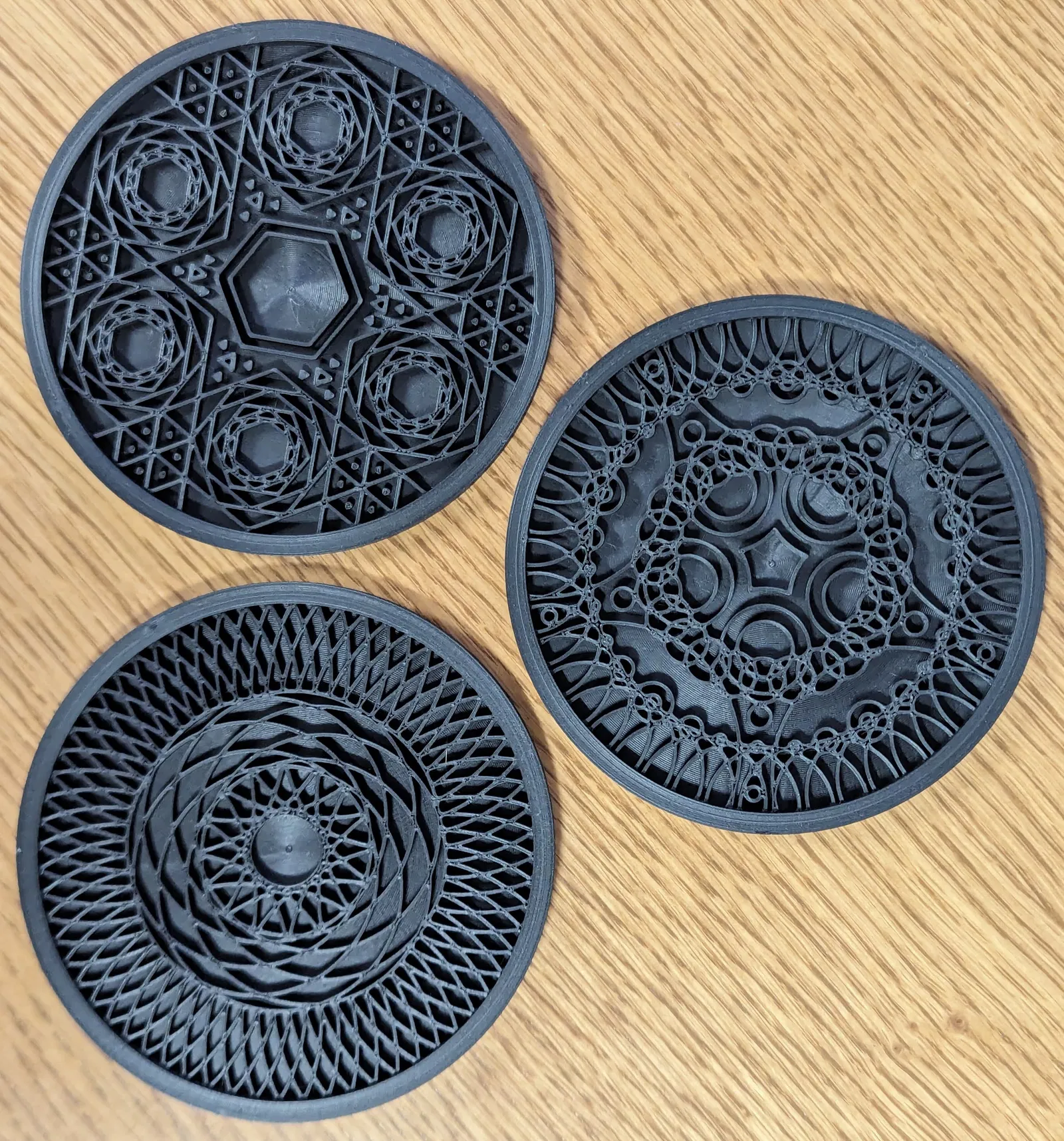 Khám phá 3 mẫu đế ly độc đáo với các thiết kế lấy cảm hứng từ Spirograph, hình tròn ngũ giác và hình lục giác. Hoàn hảo để trang trí và bảo vệ bàn của bạn!