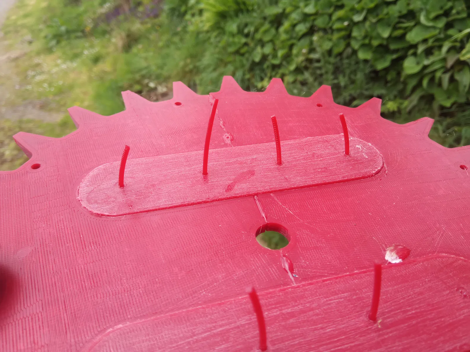 Mỗi bánh xe in gồm 4 bộ phận: hai nửa và các thanh nẹp để hỗ trợ việc dán keo. Có 4 lỗ định vị X trên mỗi bánh xe, dùng tăm 1.75mm filament làm chốt định vị để giúp giữ mọi thứ đúng vị trí khi dán keo. Sau đó, chỉ cần vặn bằng vít gỗ vào bánh xe của robot cắt cỏ.