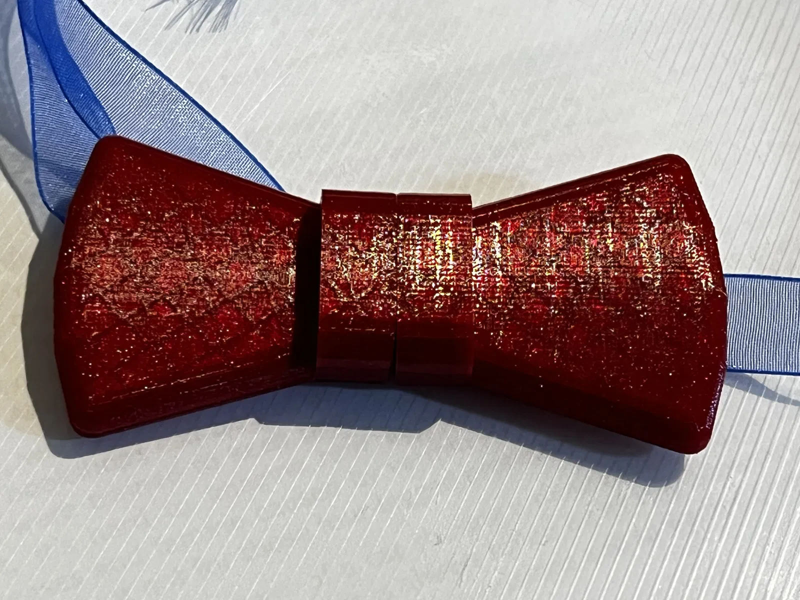 Một chiếc nơ bướm "không cần thắt" dễ in, sử dụng ruy băng rộng 12mm (½ inch) cho phần dây và bốn viên nam châm 6x2mm để cố định.