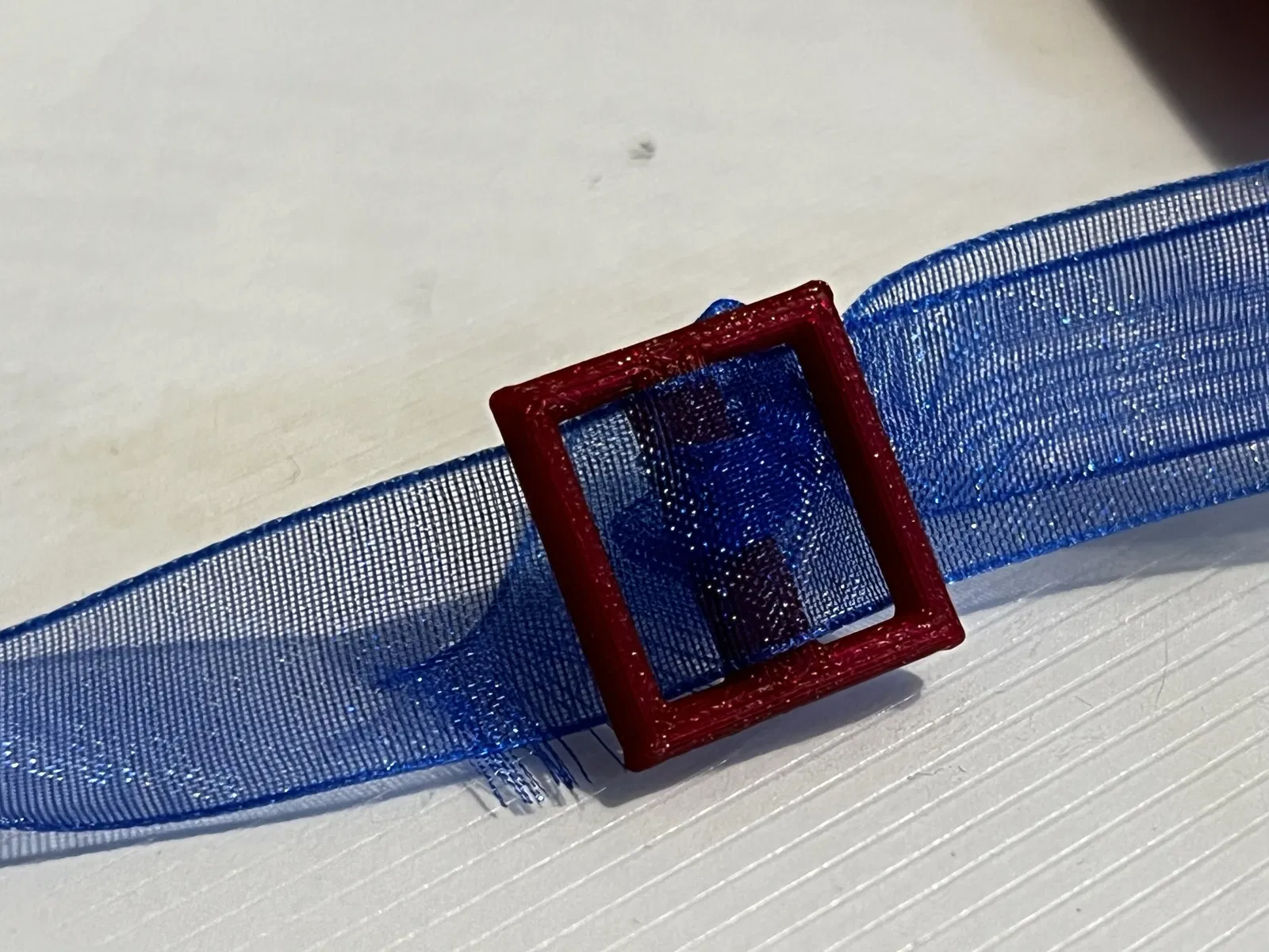 Dây đeo có thể điều chỉnh bằng một thanh trượt ba vạch in 3D và nơ bướm được đóng ở phía trước bằng nam châm.