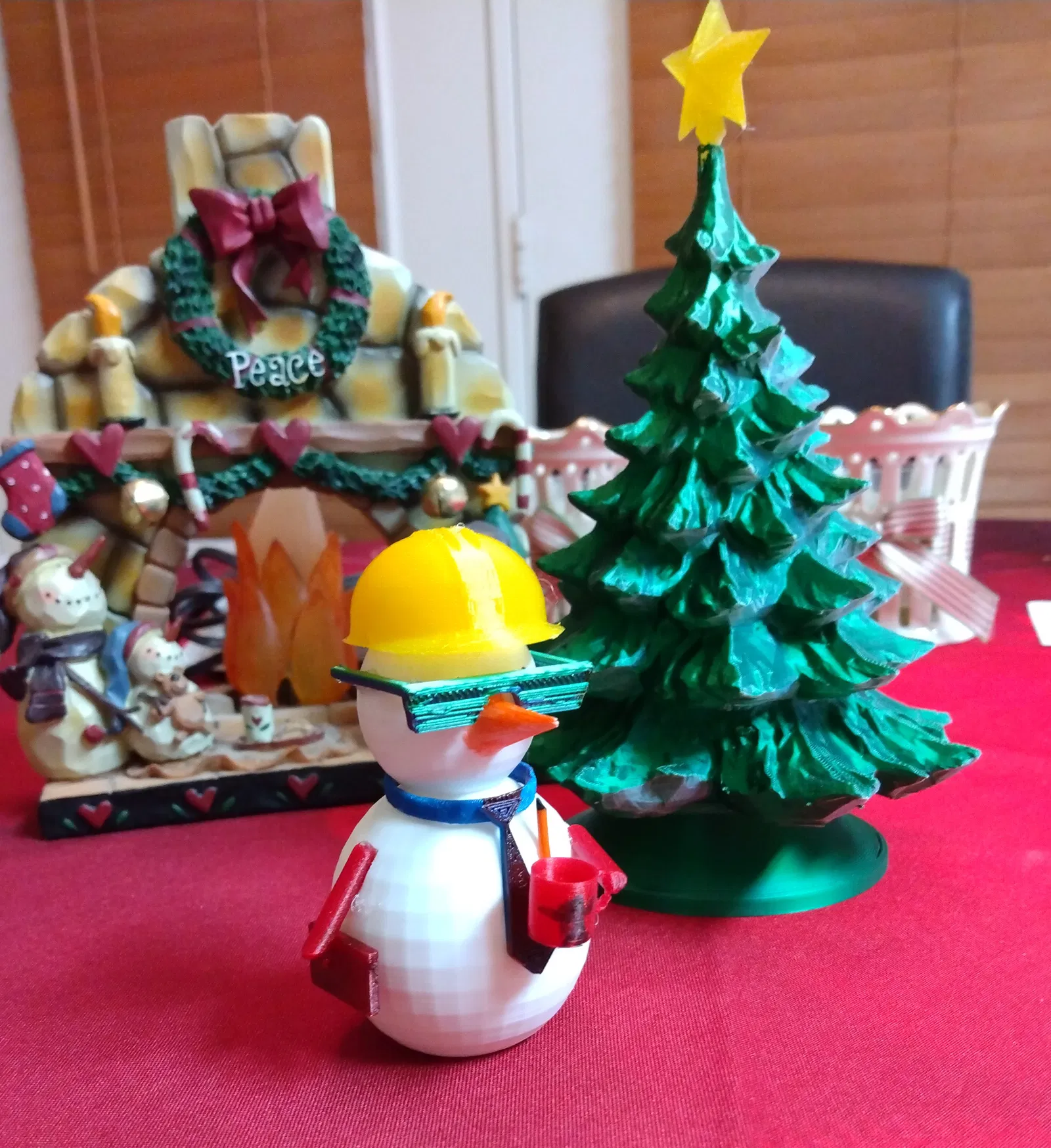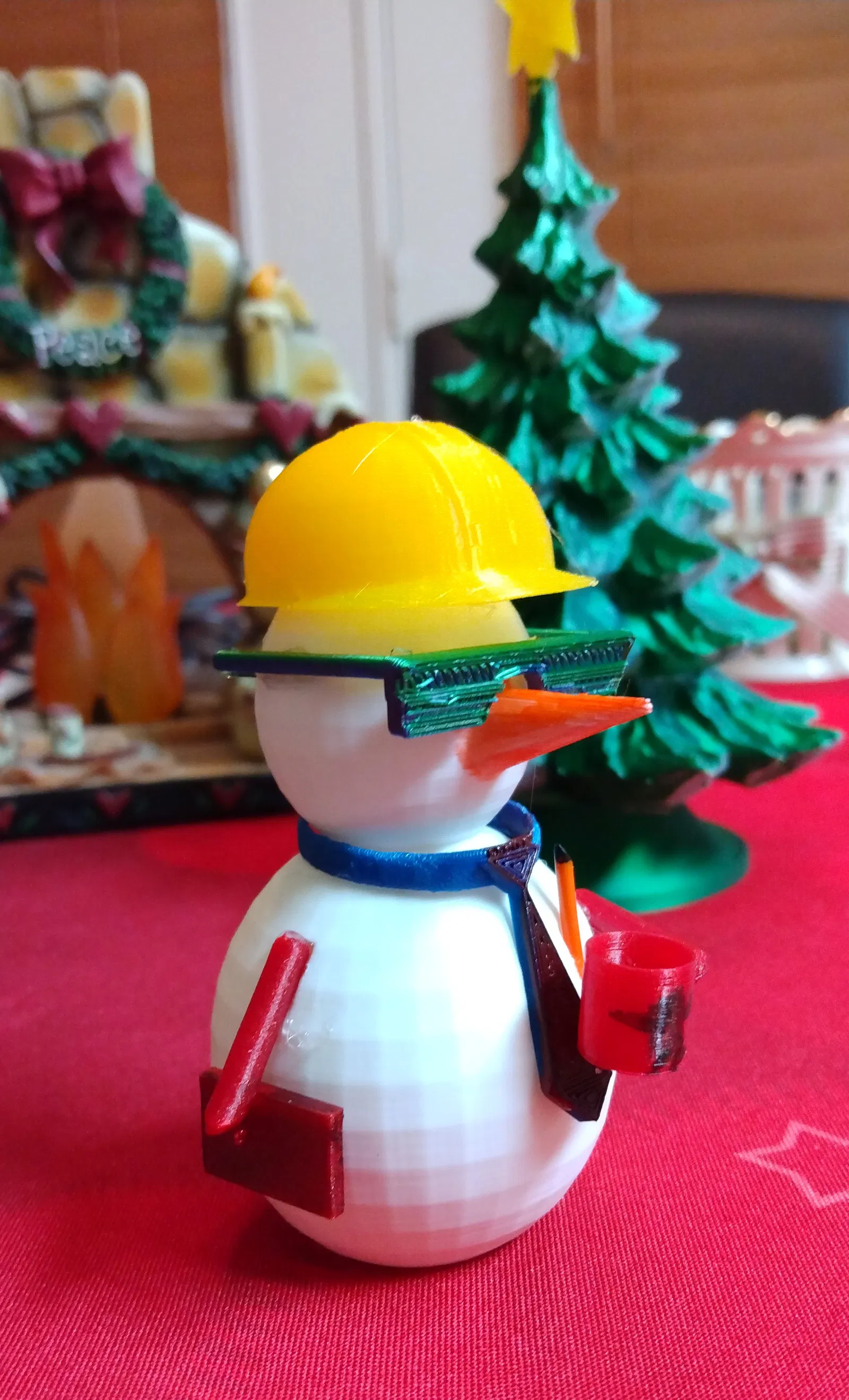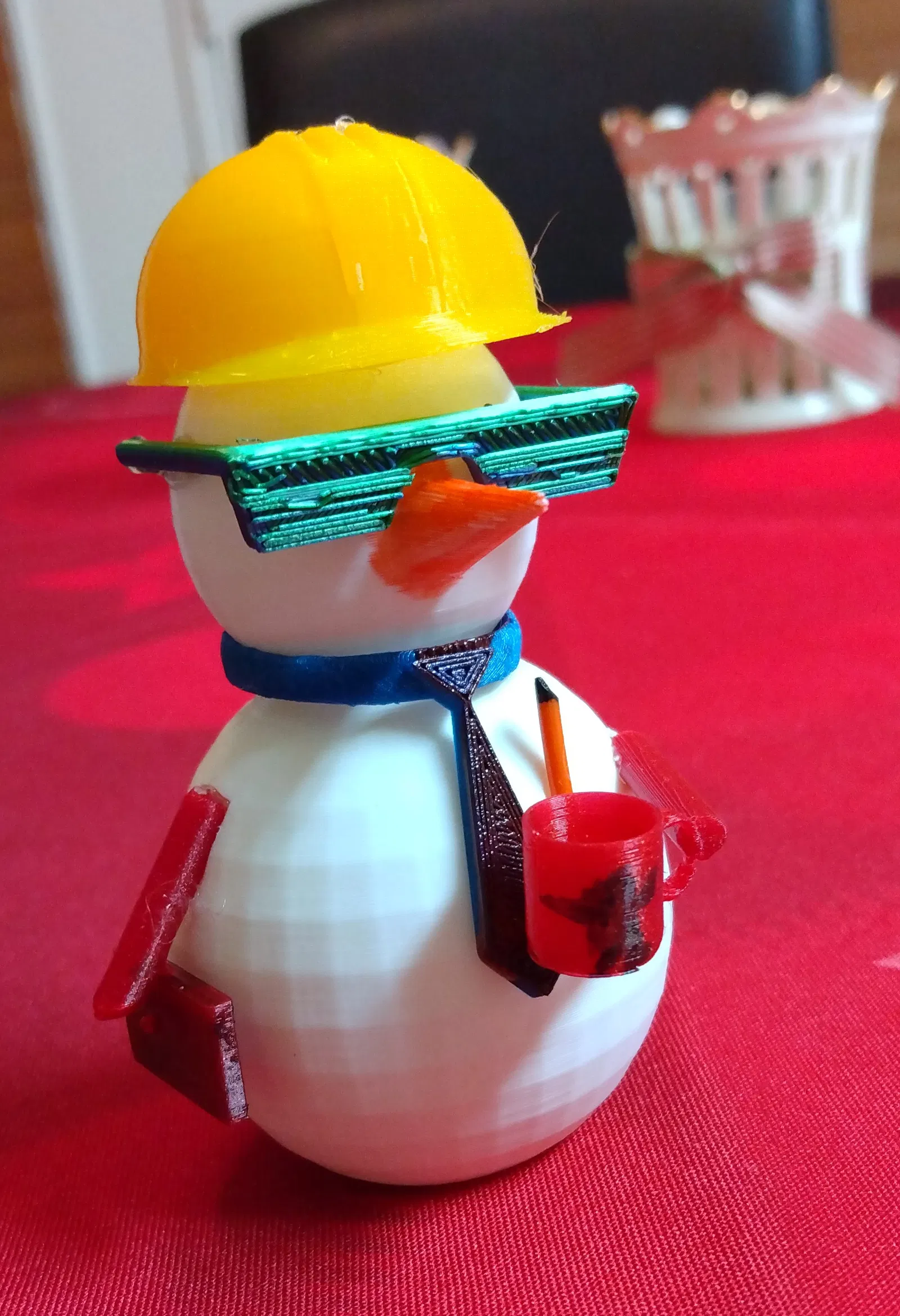 Hoặc in ông tuyết với một khối duy nhất rồi sơn, hoặc chỉ in phần thân ông tuyết và dùng keo nến nóng dán các phụ kiện lại như tôi đã làm. Tôi đã in mũ bảo hiểm, cà vạt, bảng kẹp, cốc cà phê và kính với độ cao lớp 0.1mm. Phần thân ông tuyết được in với độ cao lớp 0.2mm. Đối với cây bút chì trong túi ông tuyết, tôi chỉ cắt một đoạn dây tóc màu cam ngắn và tô màu đen ở đầu cho giống ruột bút chì.
