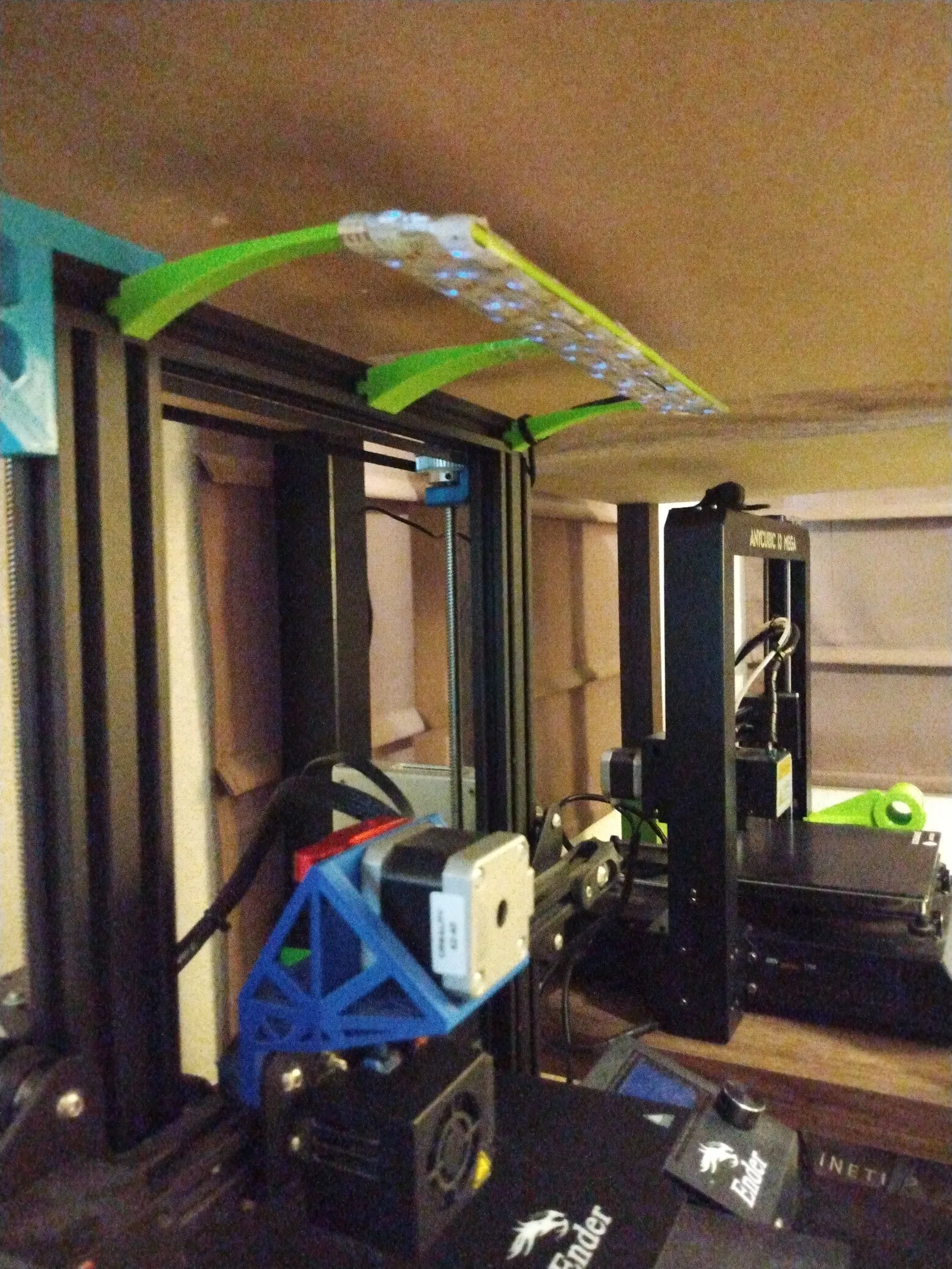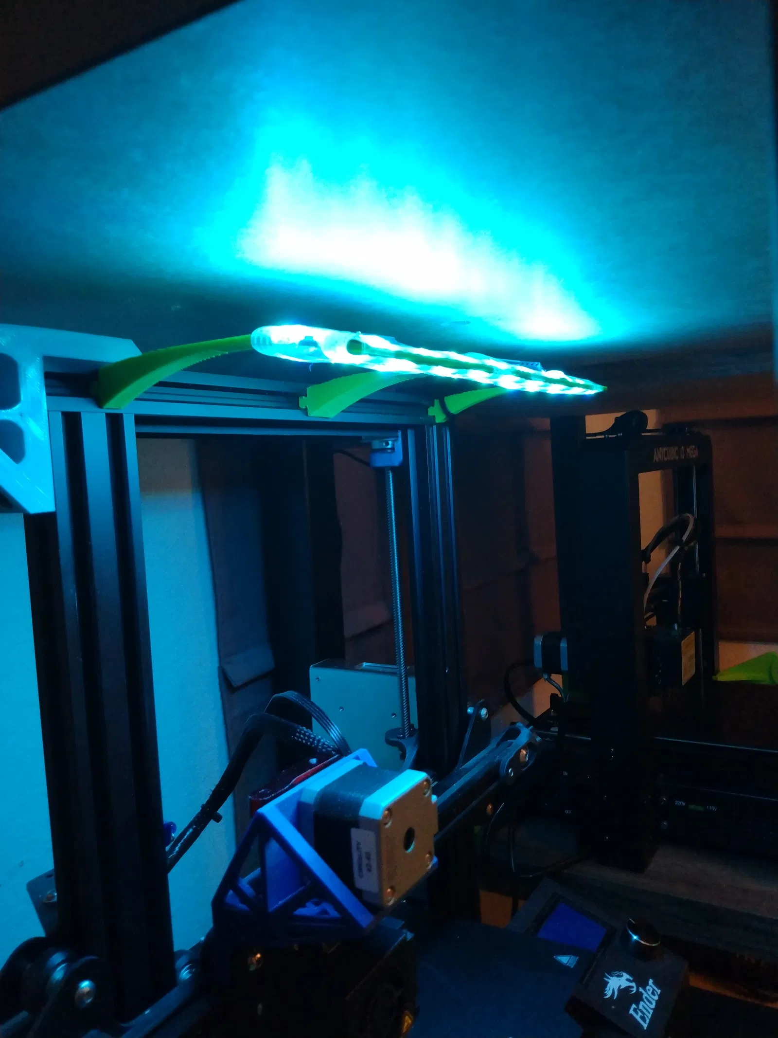 In 2 khung đèn LED, dán lại rồi nhét vào khe phía trên máy in Creality Ender, sau đó thêm dây đèn LED. Tui chia đôi thanh đèn 300mm để vừa với máy Ender3 Pro 235mm. Có nhiều cách gắn LED, tui quấn dây quanh cho khỏi cắt. Dùng support, độ cao lớp in 0.28mm, infill 15%. File STEP có sẵn.