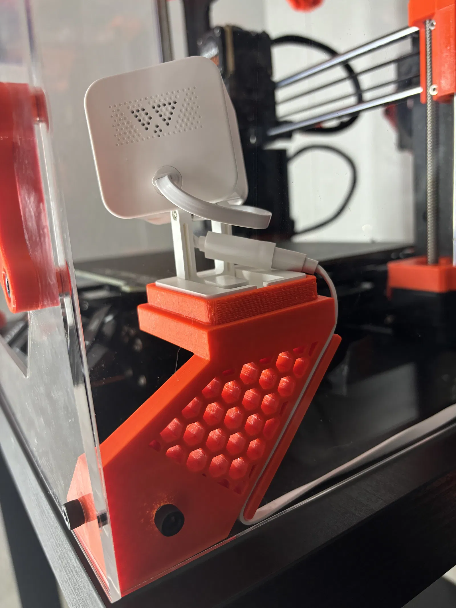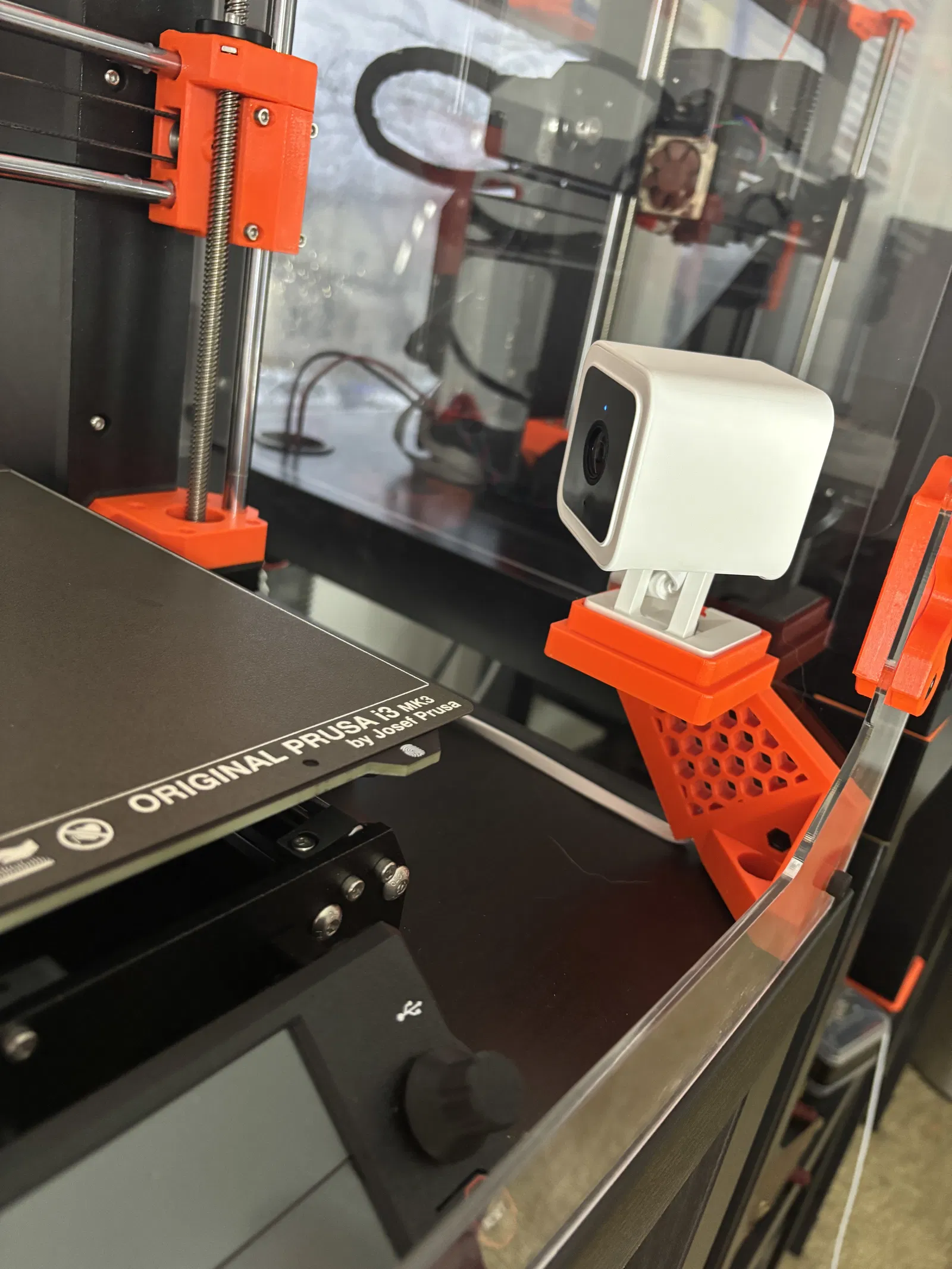 Tui muốn có một cái camera Wyze gắn dưới đáy để bộ đùn (extruder) không bị vướng khi tui đang xem bản in. Tui đã tận dụng thiết kế từ các file chân đế của DELACK enclosure và ghép với cái đế gắn camera Wyze. Tui đã làm một file có họa tiết lỗ lục giác y chang thiết kế trên mặt lưng của máy in MK4. Tuy nó khá thoáng khí, nhưng tui thấy tui thấy tốn thời gian in hơn file trơn một chút, tùy thuộc vào độ đặc (infill).
