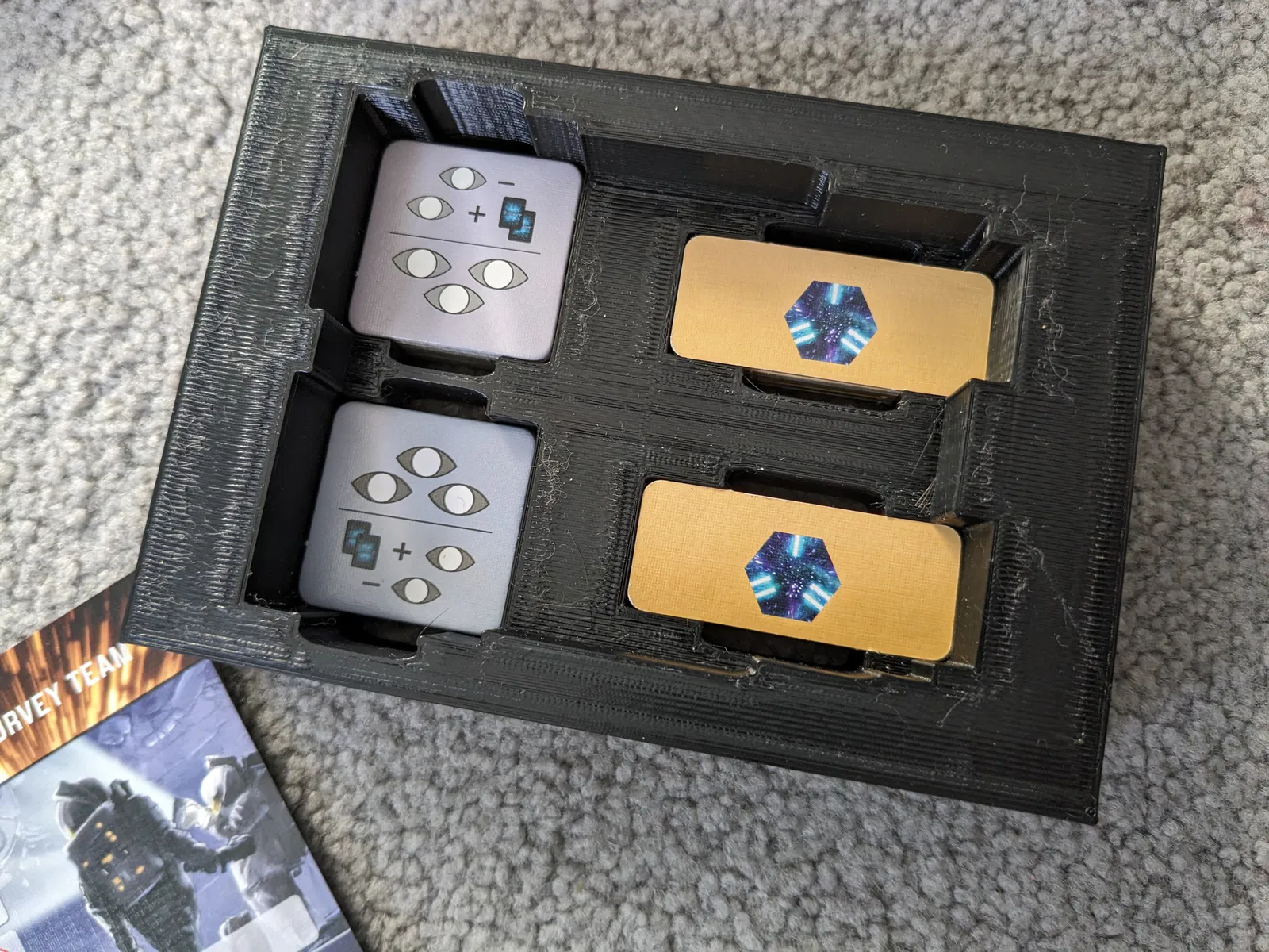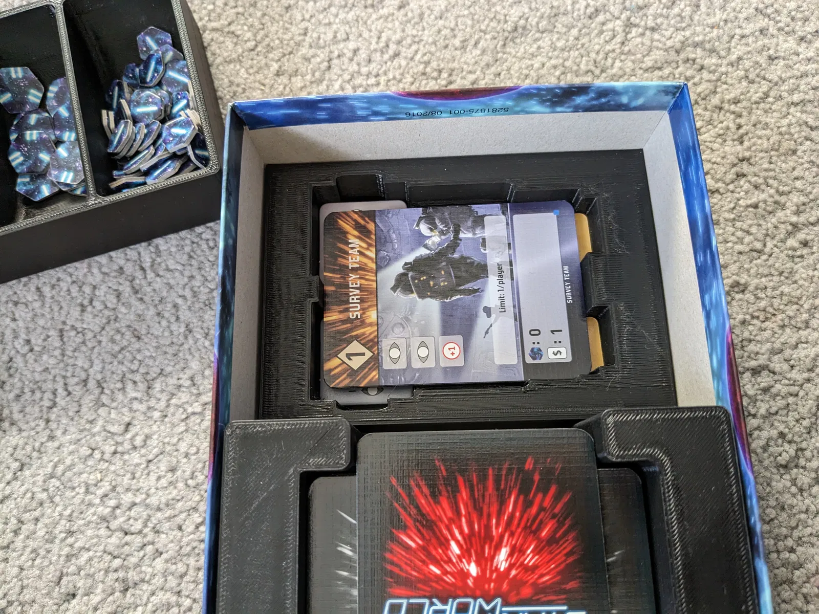 Thiết kế lại khay đựng token cho bản mở rộng "Terminal Velocity" và token khám phá cho game Jump Drive. Phiên bản này có thêm một ô phía trên để giữ các lá bài tách biệt khỏi bộ bài chính, giúp tôi sắp xếp bàn chơi nhanh hơn. Các bạn xem thêm mẫu gốc mà tôi đã "remix" lại nhé. Ngoài ra còn có các bộ phận khác của khay đựng (hoặc một thiết kế khác đẹp hơn cho phần này).