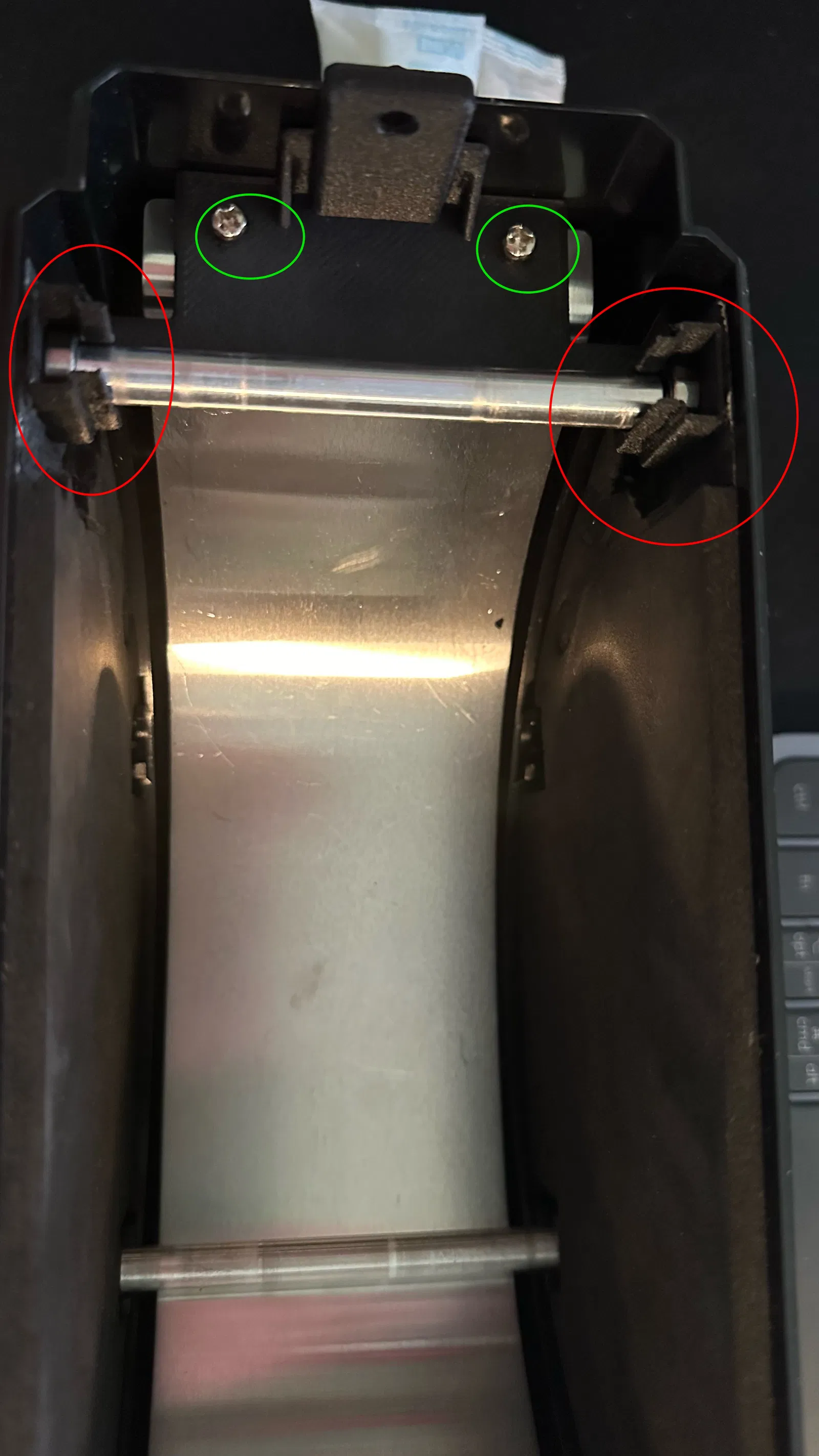 2. Tháo hai vít giữ tấm gia nhiệt kim loại (được khoanh tròn màu xanh lá cây)