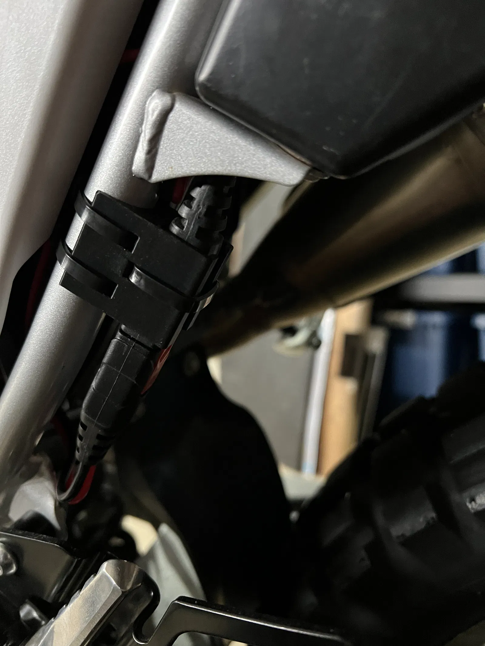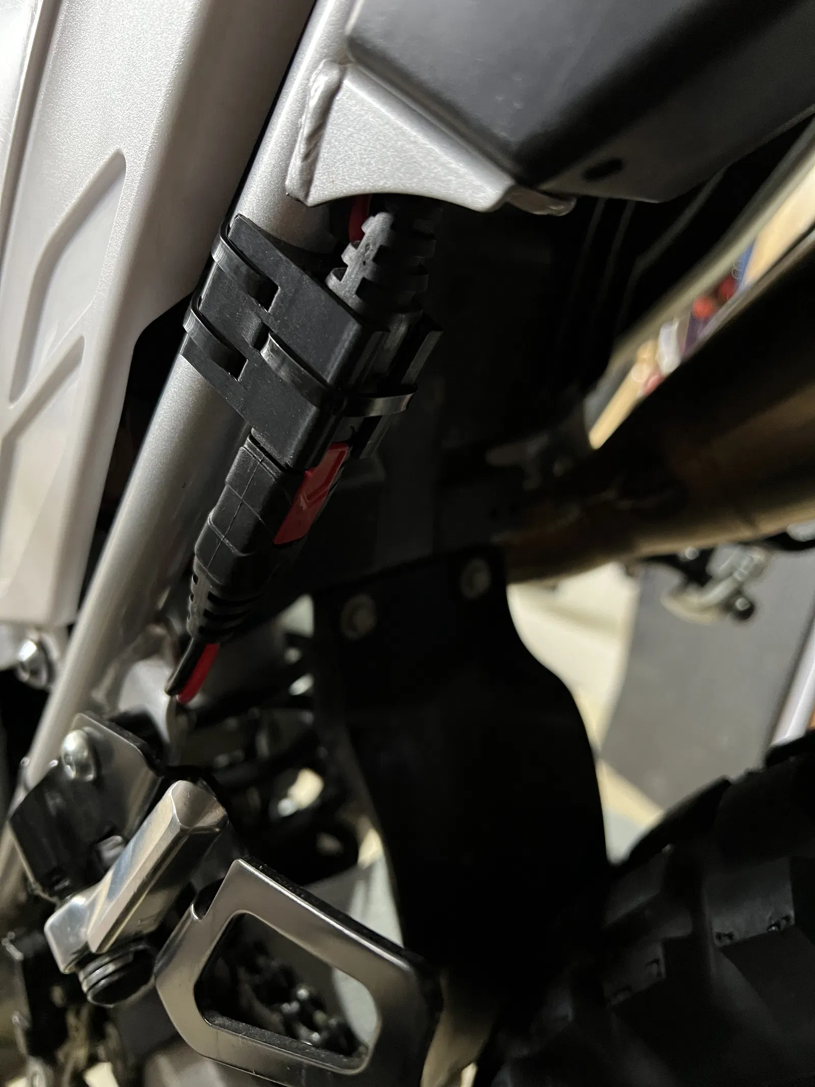 Pat gắn dây sạc Noco Genius 2 lên sườn xe máy Yamaha WR250R. Giúp cố định đầu nối Noco trên thanh sườn 20mm, tiện lợi vừa sạc xe vừa cấp nguồn USB khi đi tour.