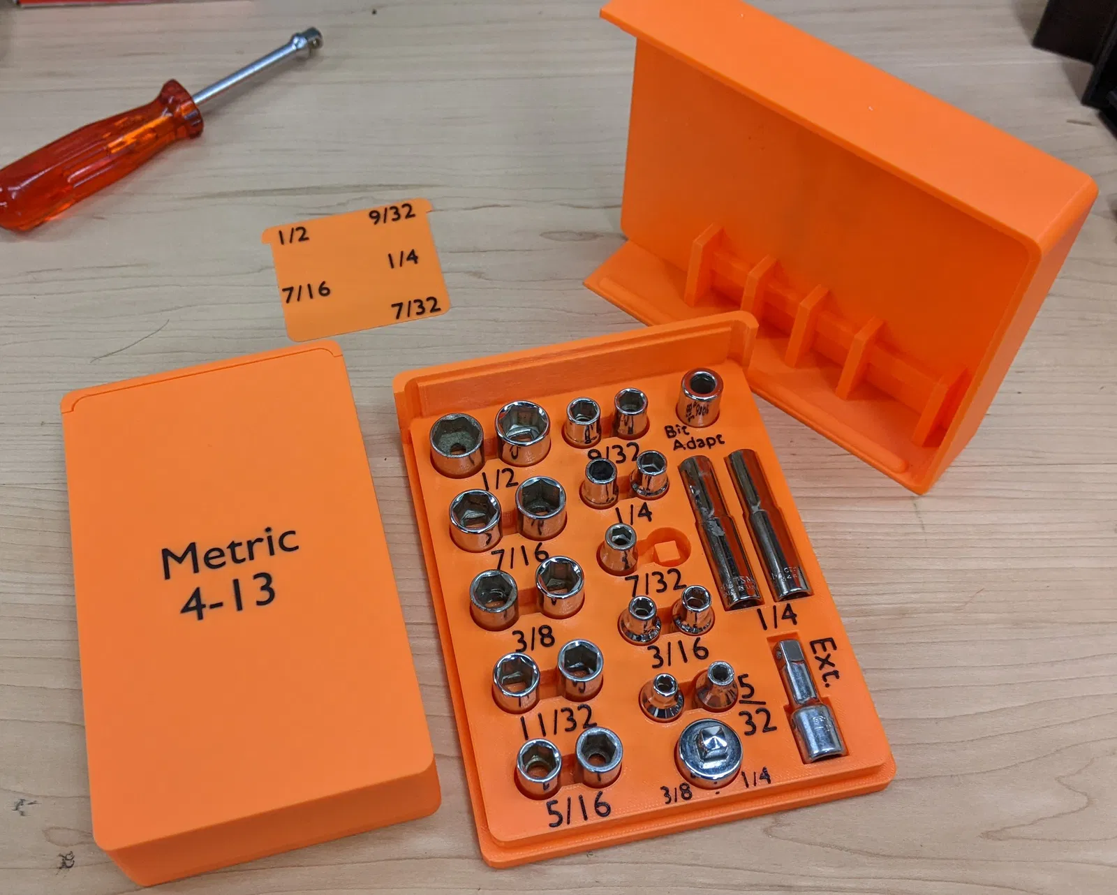 Dùng xong hộp đồ nghề cũ, tuýp cứ rơi ra hoài nên tôi thiết kế hộp đựng tuýp ¼ inch cho cả hệ Metric và Standard. Hộp có nắp trượt, đựng được hai cái cho mỗi loại. Bạn có thể tùy chỉnh màu sắc chữ và tham khảo thêm cách in đa màu.