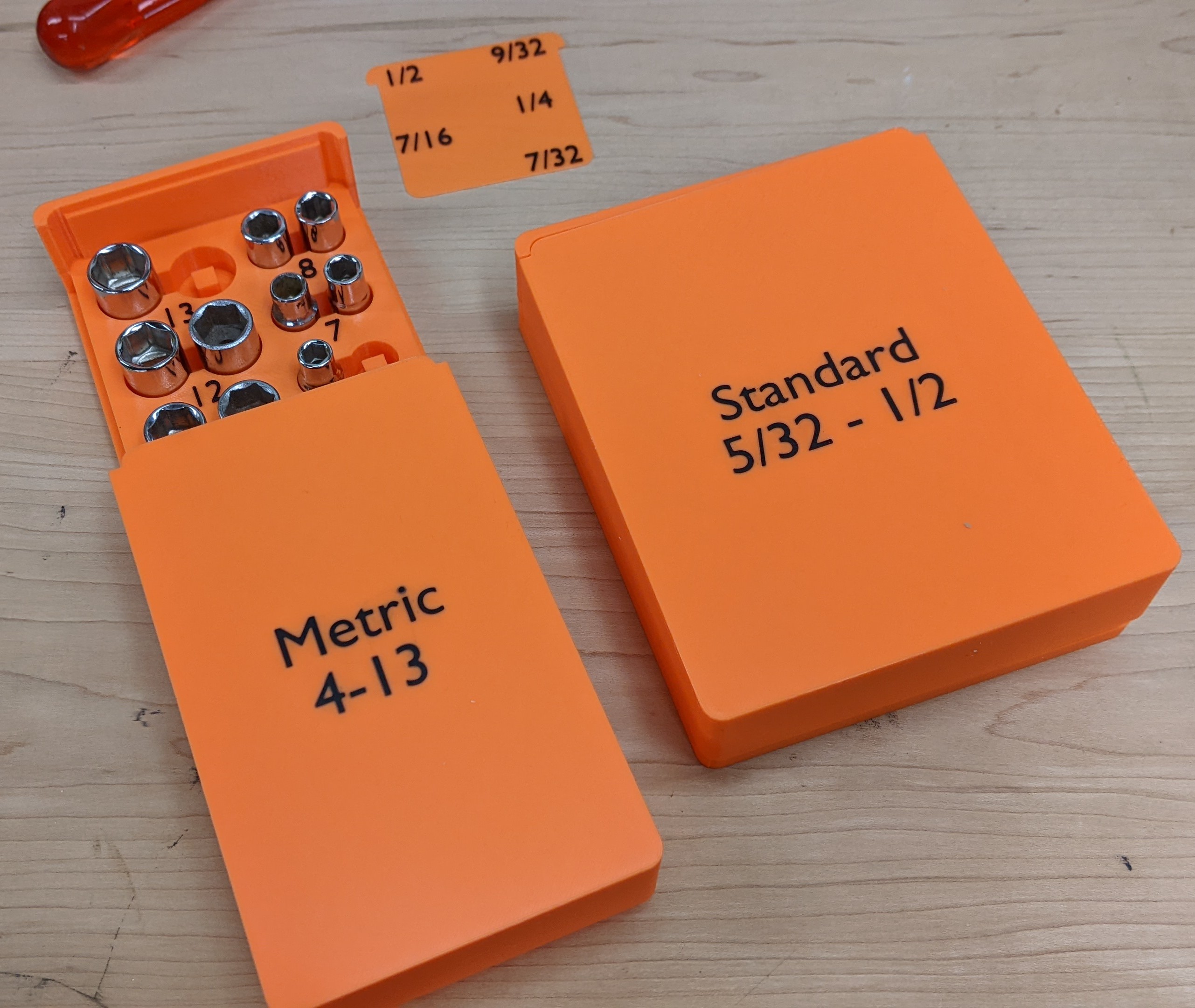 Tôi làm một cái cho hệ Metric và một cái cho hệ Standard cho tuýp ¼. Phần nắp trượt vào nên nếu bạn có lỡ làm đổ thì tuýp cũng không bị rơi ra hết. Và bạn cũng có thể lấy cả cái hộp ra khỏi hộp đồ nghề mà không sợ bị tuột nắp ra. Cái đế đựng cho hệ Standard có mấy cái thanh đỡ trong nắp để giữ luôn cả mấy cái tuýp sâu được cố định.