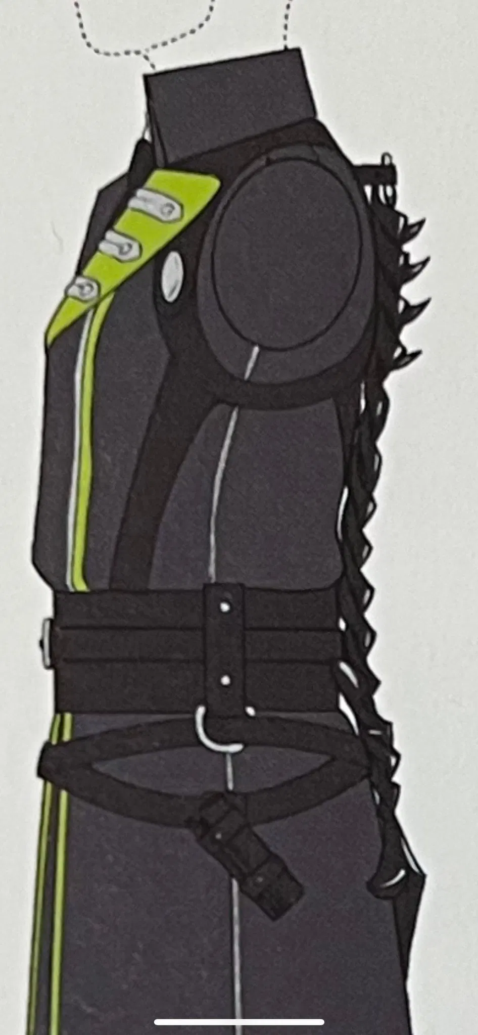 Phần gai được đánh số từ 1 (gần cổ nhất) - 14. Chúng được dán lên một sợi dây đeo 1" (cũng vừa với dây đeo 1.5") rủ xuống phía sau.