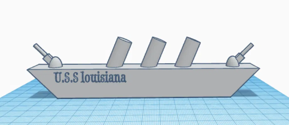 Mô hình chiến hạm USS Louisiana đơn giản. Mặc dù biết USS Louisiana là tàu ngầm hạt nhân, người tạo đã biến tấu nó thành một chiến hạm với hai khẩu súng đơn ở phía trước và sau.