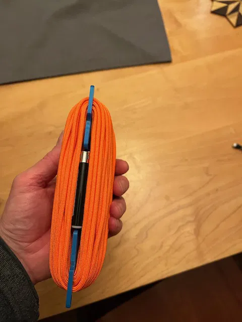 Cái quấn dây paracord này chứa được khoảng 100 feet (30 m) dây paracord 550, và nó cũng cất vừa một cái bật lửa mini bic và một cái kim luồn dây paracord nhỏ. Các đế giữ có thể dán keo (đó là ý định ban đầu của tôi), nhưng tôi chỉ để chúng giữ bằng lực ma sát mà không cần keo.