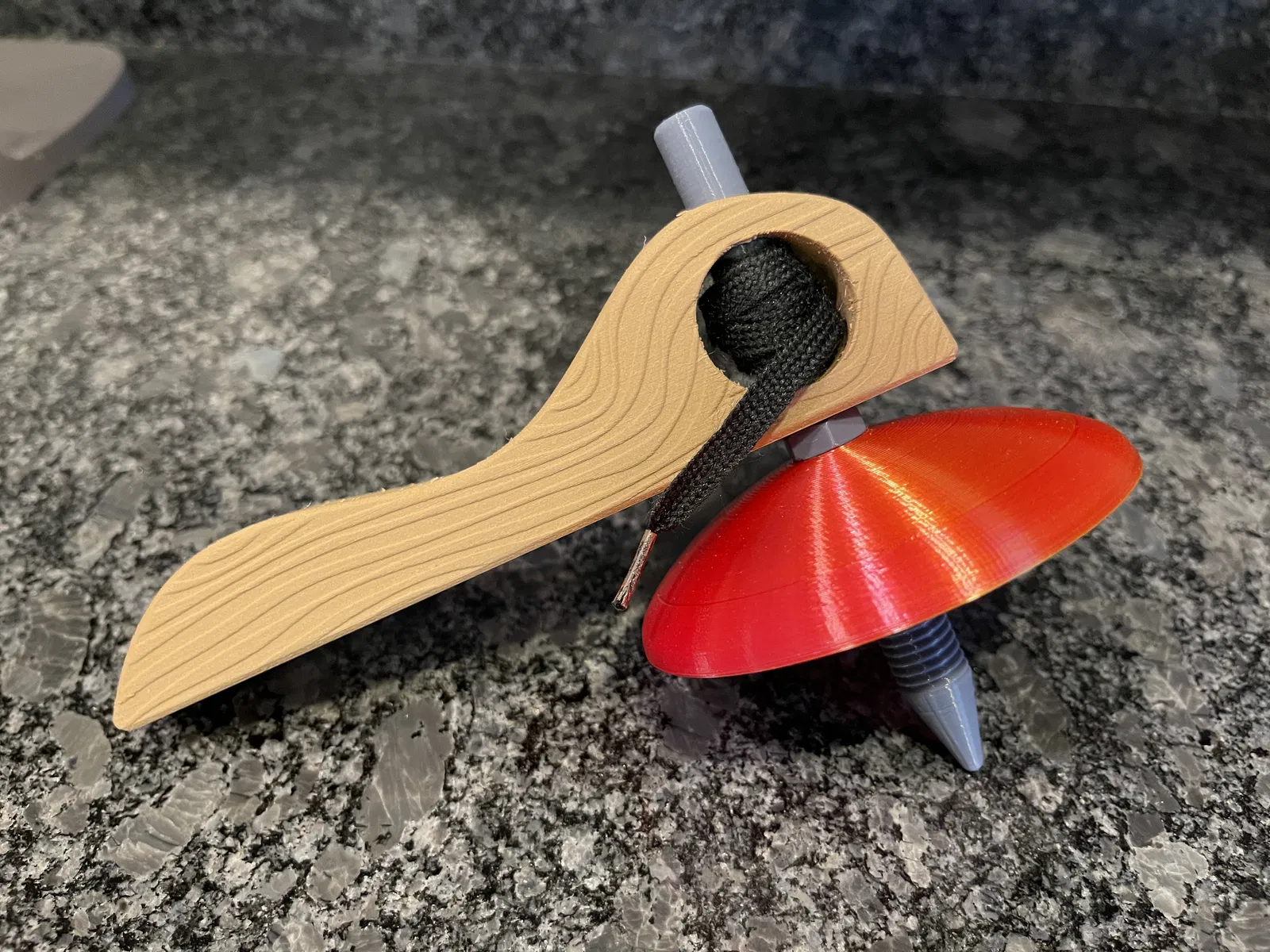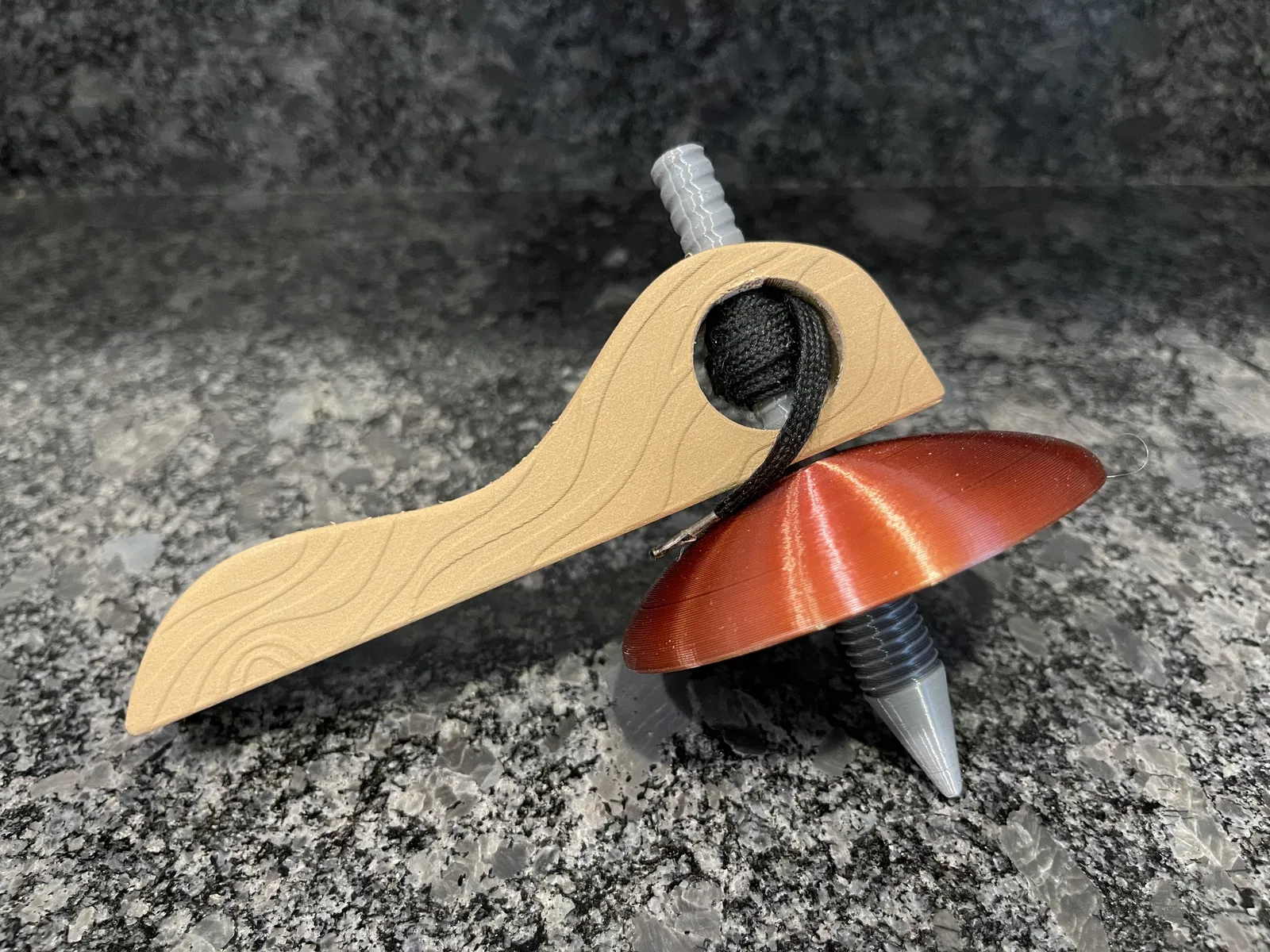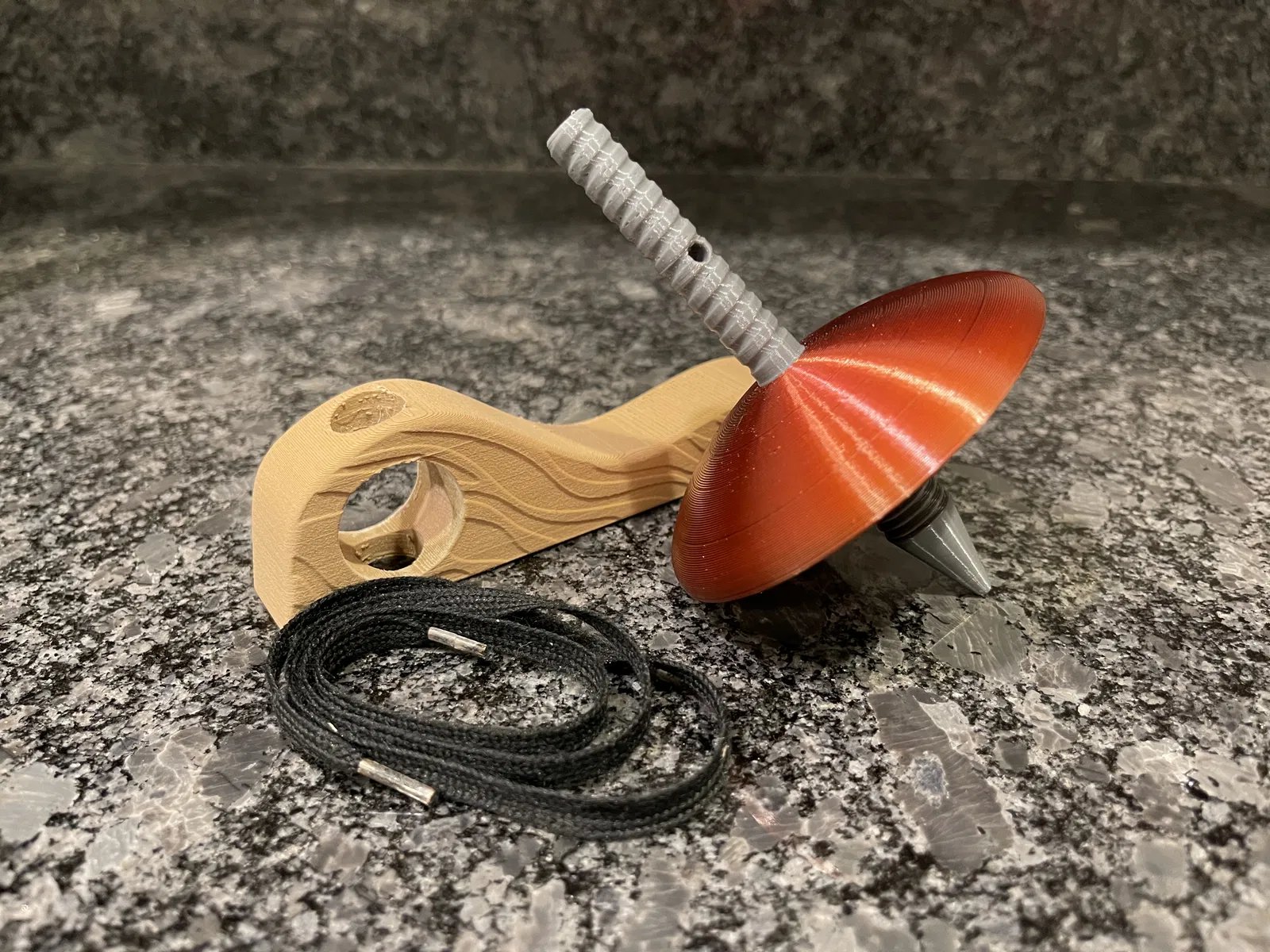 Vì vậy, tay cầm bao gồm một số họa tiết mô phỏng vân gỗ. Nó không hoàn hảo, nhưng tôi nghĩ nó trông khá ổn. Trục của con quay được chia thành hai phần vì một vài lý do. Thứ nhất, nó dễ in hơn mà không cần hỗ trợ và thứ hai, điều này cho phép bạn tinh chỉnh và tùy chỉnh thêm với các màu sắc khác nhau nếu bạn muốn. Một tệp STL trục hoàn chỉnh cũng được bao gồm ở đây. Tôi thấy khó in mà không bị rung, dẫn đến các bản in thất bại. Ngoài bốn bộ phận in, bạn sẽ cần một sợi dây. Con quay ban đầu của tôi đi kèm với một dây giày, mà tôi tin là tối ưu vì các đầu cứng rất tuyệt để luồn dây và cung cấp độ căng lý tưởng khi kéo dây.