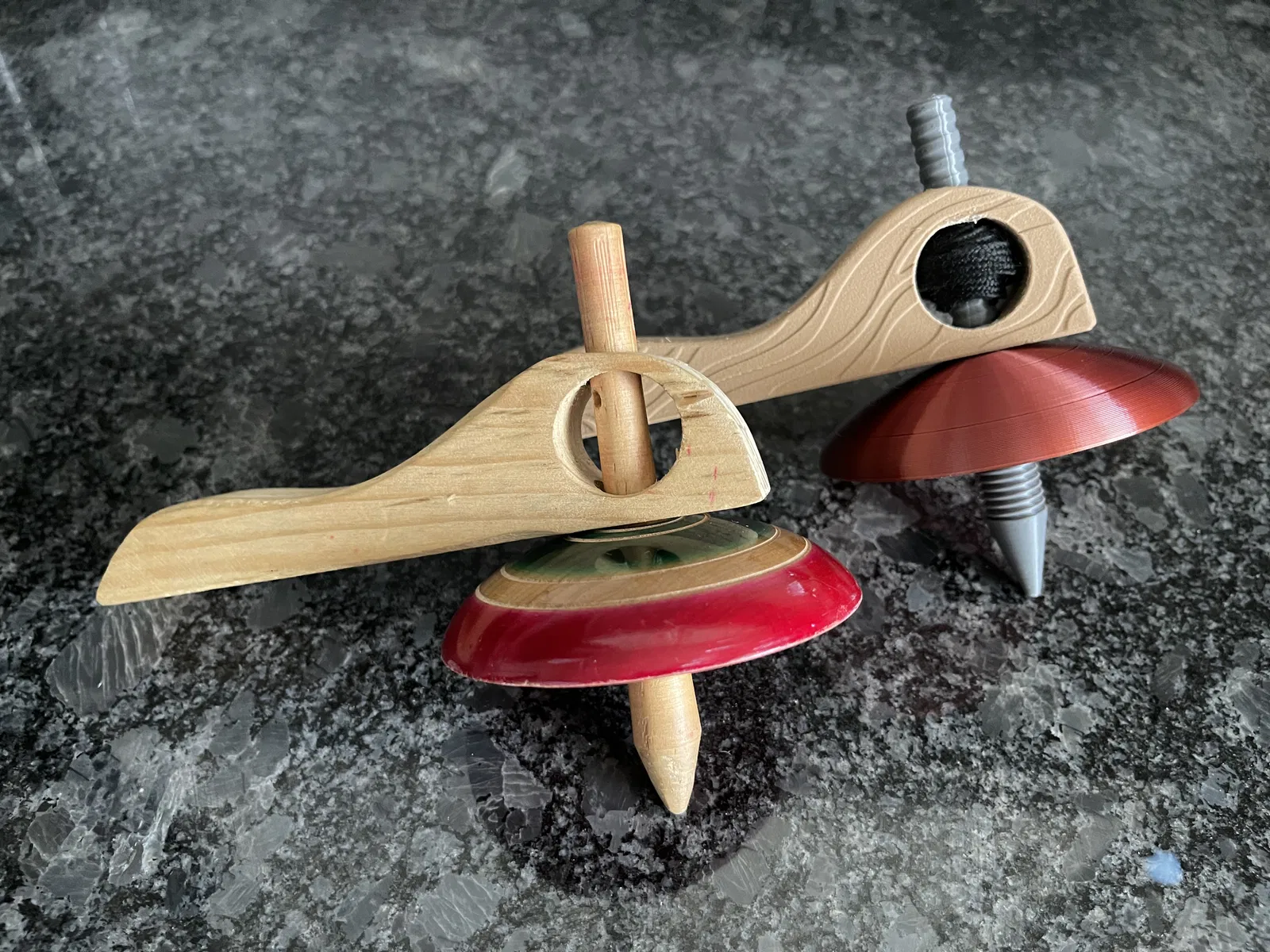 Đây là bản tái tạo con quay kéo dây thời thơ ấu của tôi. Nó có tay cầm bằng gỗ mộc, với 'vòm' được sơn và chia phần. Khi tái tạo, tôi muốn làm cho nó trông chân thực, nhưng tôi cũng muốn thêm một số tùy chọn tùy chỉnh thú vị.