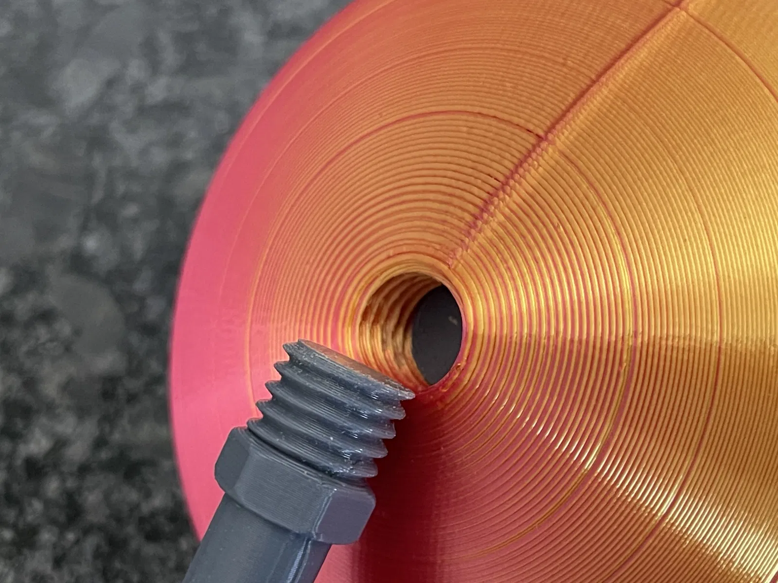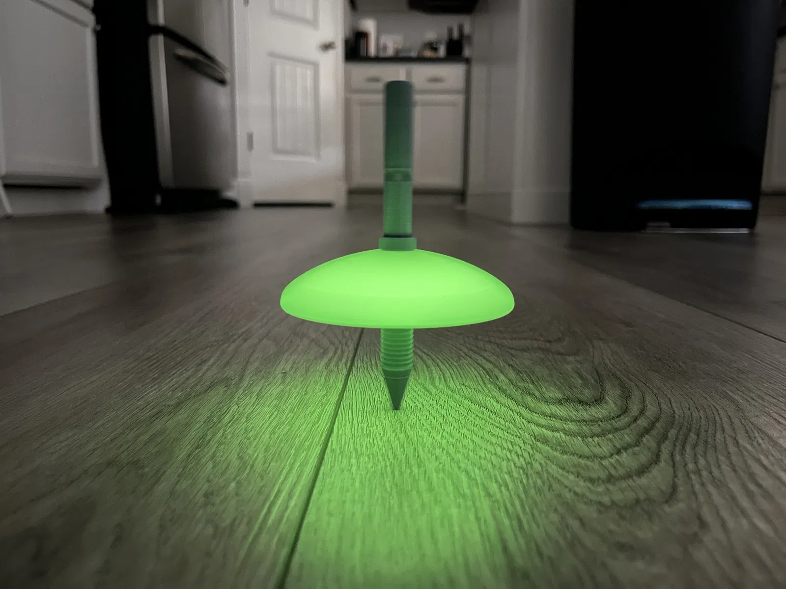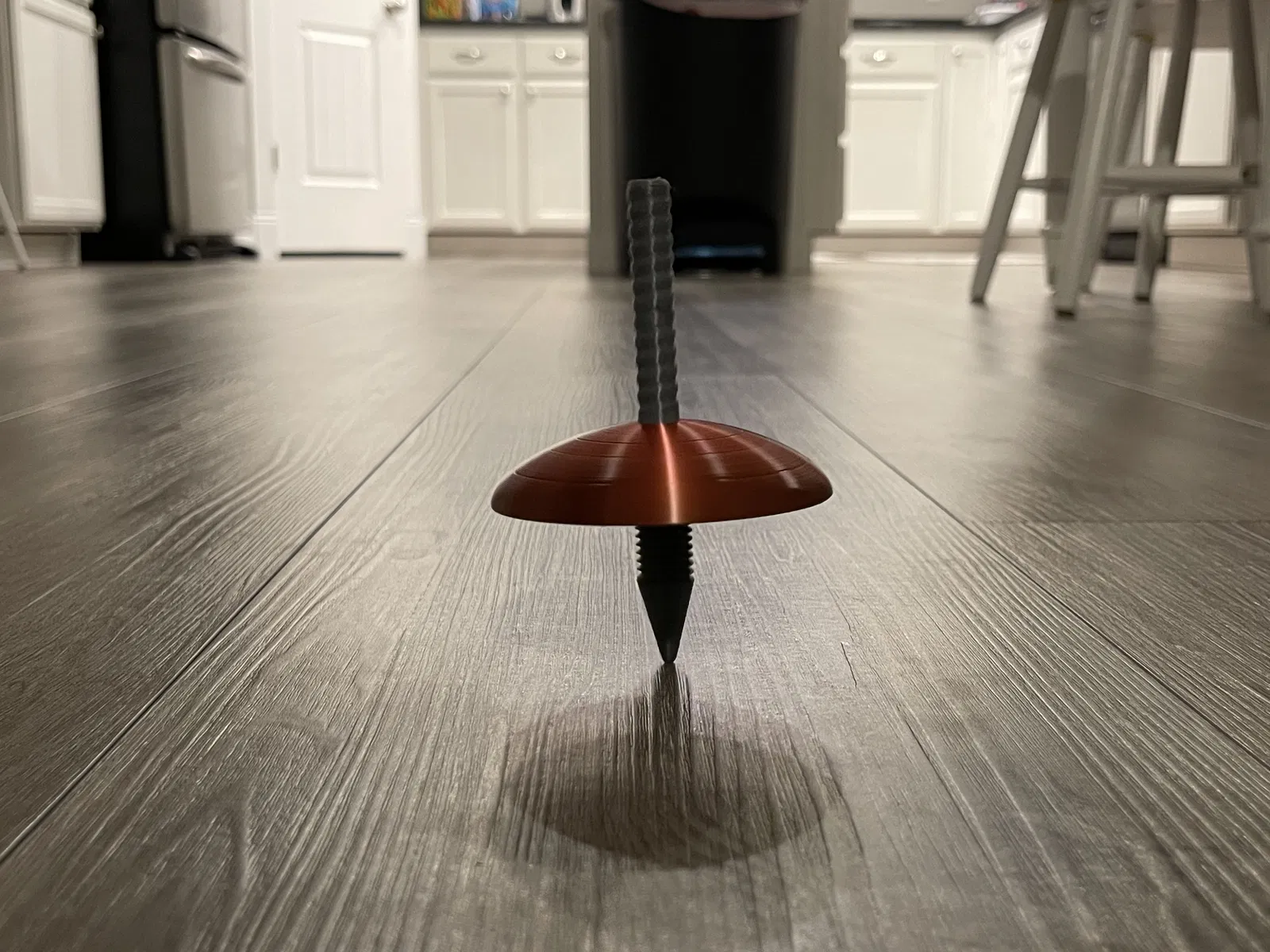 Tôi đã thêm mẫu 'v2' của con quay, mẫu này không cần keo dán để lắp ráp. Thay vào đó, phần vòm và trục có ren vặn. Tôi đã in ở độ cao lớp 0.16mm và ren hoạt động tốt. Cả mặt trên và mặt dưới của trục đều có đai ốc 12mm tích hợp sẵn. Bạn có thể dùng cờ lê hoặc mỏ lết để lắp lần đầu. Sau đó, tôi thấy bạn có thể nới lỏng/siết chặt bằng tay. Sử dụng độ điền đầy cao hơn cho phần vòm (khoảng 25%) giúp chuyển động của con quay bớt thất thường và bền hơn. Thông thường, với độ điền đầy 25%, tôi có thể quay khoảng 90 giây. Với độ điền đầy 100%, tôi có thể quay tới 220 giây. Tôi cũng đã đính kèm một lựa chọn tay cầm thứ hai với giao diện vân gỗ khác.