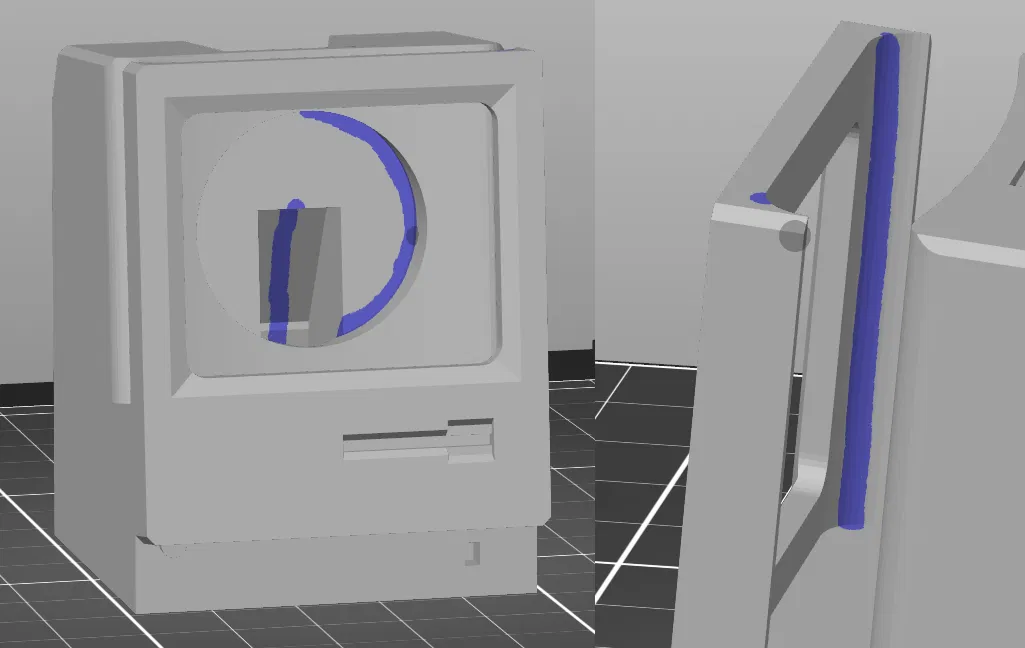 Khi Slicing, bạn nên thêm các tùy chọn seam blockers và/hoặc enforcers để đảm bảo mặt trước/hai bên sạch sẽ và đường nối được giấu đi ở vị trí đặt sạc. Đừng quên giấu các Z-seam ở bên trong viền màn hình dọc. (như trong hình)
