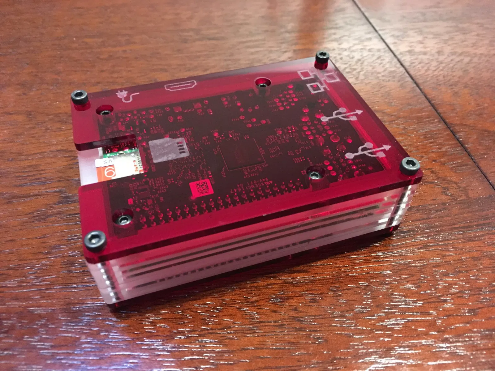 Pi được gắn vào bốn điểm trên lớp thứ hai của vỏ. Các bu lông gắn nó được lắp chìm qua các lỗ trên lớp đầu tiên. Bạn sẽ cần bốn bu lông nhỏ 3mm để gắn Pi vào vỏ và thêm bốn bu lông 3mm nữa để đi qua các góc.