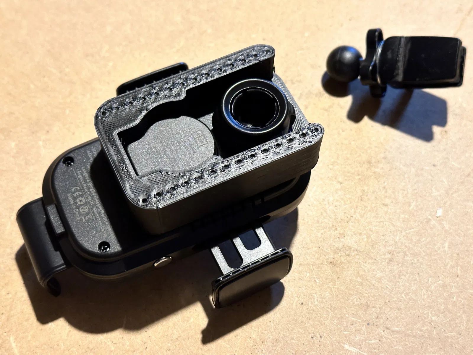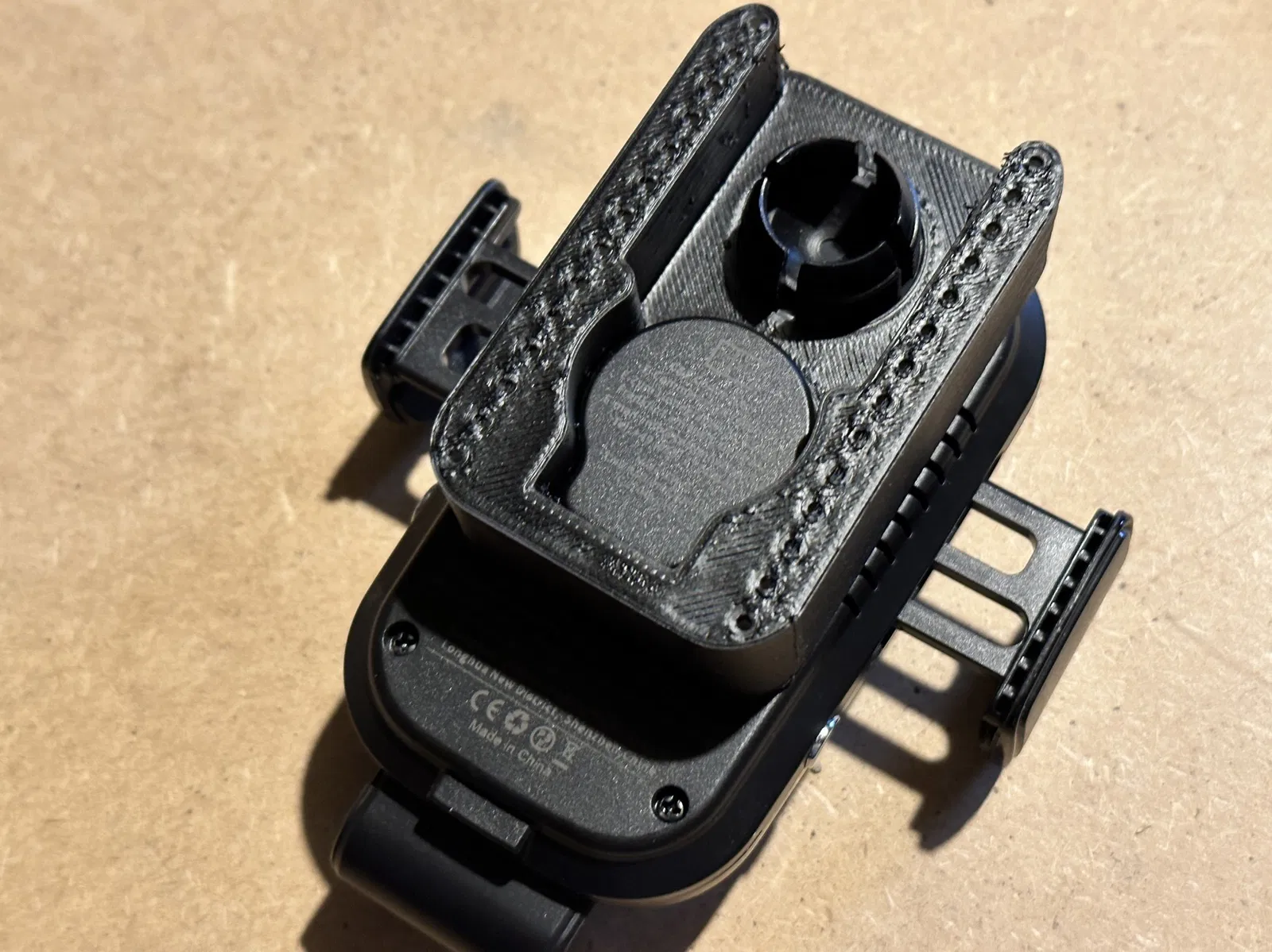 Đây là một bộ chuyển đổi để gắn sạc Qi động cơ này. Đai ốc từ giá đỡ bóng của bộ sạc được sử dụng để cố định nó vào bộ chuyển đổi. Khoảng cách lỗ 38mm bên trái và bên phải mượn từ tiêu chuẩn tấm gắn "HR Herbert Richter" (trước đây?) phổ biến.