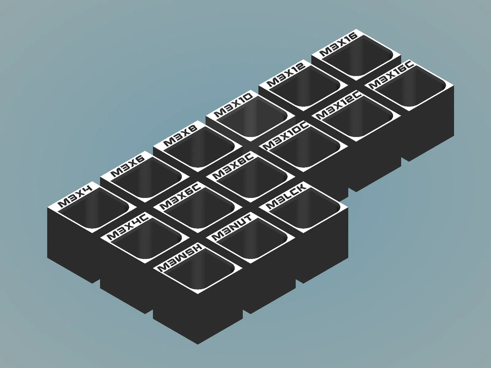 Phụ kiện insert để đựng ốc và đai ốc M3 cho khay BaBo organizer. Thiết kế này giúp bạn sắp xếp các loại ốc M3 khác nhau một cách gọn gàng, dễ tìm kiếm. Kích thước 1x1, tương thích với BaBo organizer của Willi. Hướng dẫn in chi tiết kèm theo.
