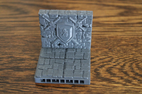 Tấm tường OpenLock với kiếm và khiên trang trí, một phần của hệ thống gạch dungeon OpenLock. Hoàn hảo cho các bàn chơi game nhập vai như D&D và Pathfinder. In không cần support với độ cao lớp .2.