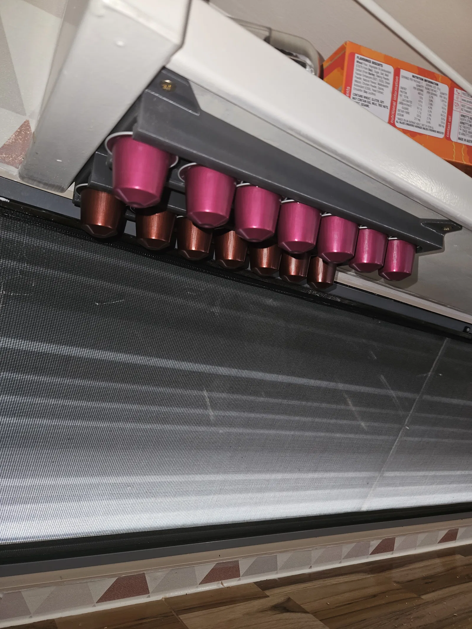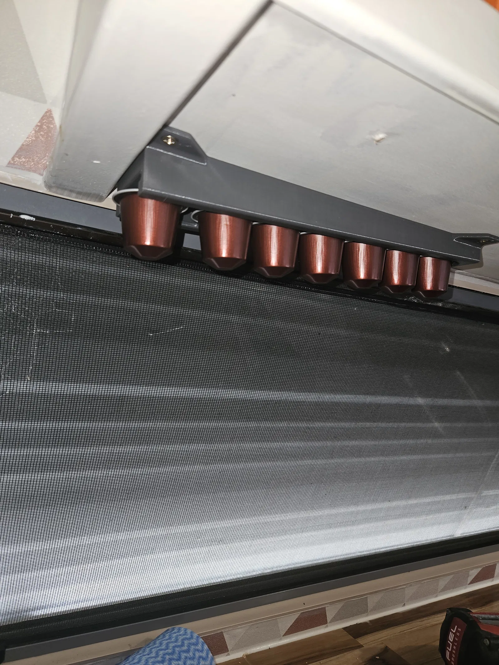 Giá treo cà phê viên nén gắn dưới gầm, có kẹp giữ, rất phù hợp cho xe caravan hoặc RV. Mỗi hàng chứa 7 viên, gắn bằng 4 vít côn vát cạnh.