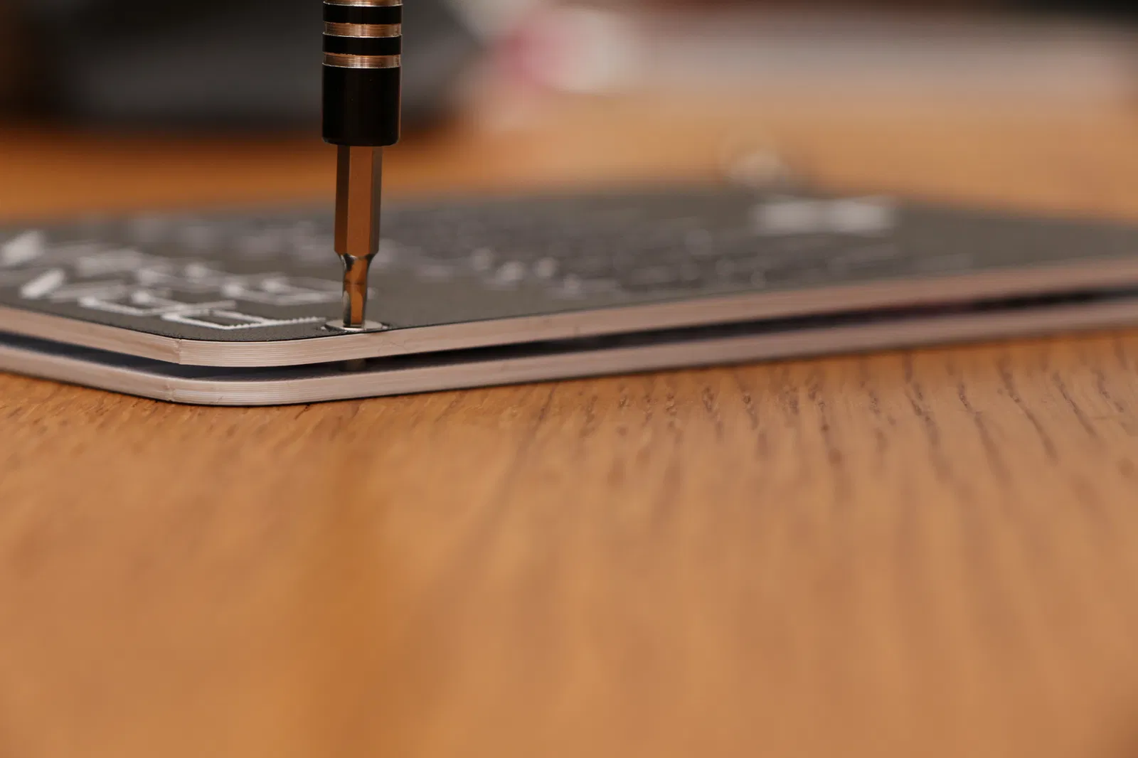 Vặn (vít chìm M3 5 mm) hoặc dán hai mặt trước lại với nhau, đảm bảo không có keo làm kẹt các thanh trượt trong rãnh.