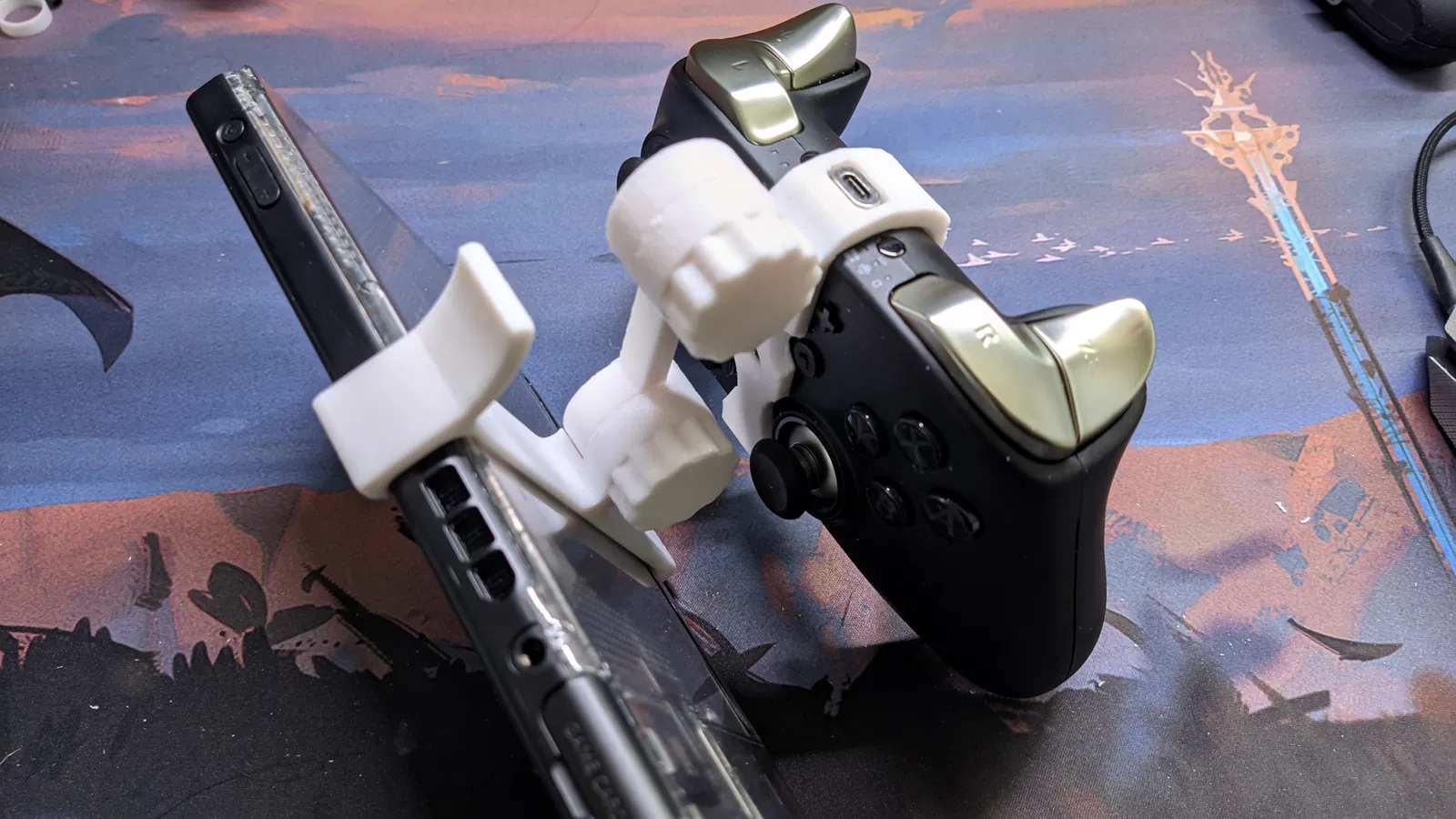 Giá đỡ Gulikit KingKong 2 Pro cho Nintendo Switch, với tay cầm ở dưới và Switch ở trên, kết nối bằng cánh tay khớp nối linh hoạt. Sản phẩm gồm đế gắn, kẹp tay cầm, cánh tay và ốc. In bằng PLA+ hoặc PETG, dễ dàng lắp đặt và sử dụng.