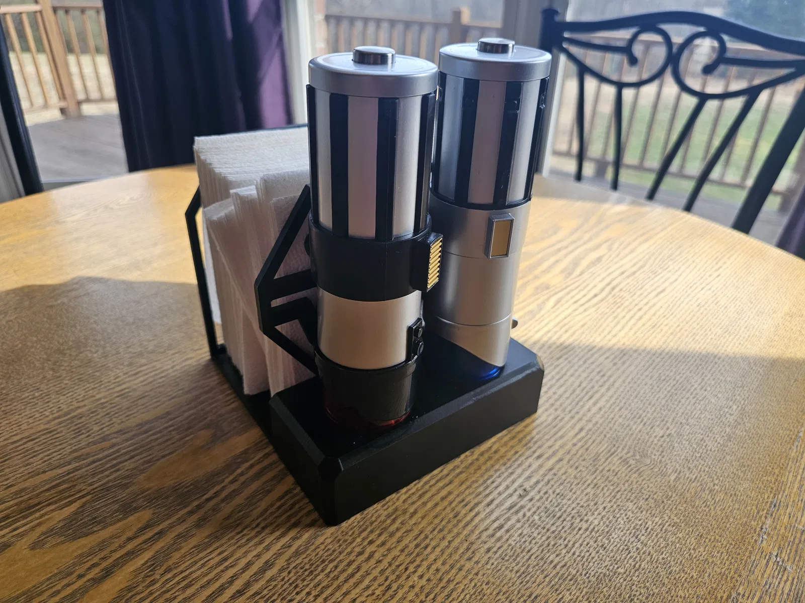 Cái đế cắm khăn ăn này có hình bóng ở mặt trước, cùng với logo STARWARS và chỗ cắm máy xay muối tiêu hình thanh kiếm ánh sáng ở mặt sau. Tôi đã thiết kế chỗ cắm sao cho nắp của máy xay sẽ bám nhẹ vào hai bên của đế cắm. Khi bạn nhấc máy xay lên, nắp sẽ ở lại trong đế cắm. Giúp bạn sử dụng máy xay mà không cần lo lắng về nắp. Có một lỗ ở dưới đáy mỗi chỗ cắm để bạn có thể dễ dàng tháo nắp ra nếu cần.