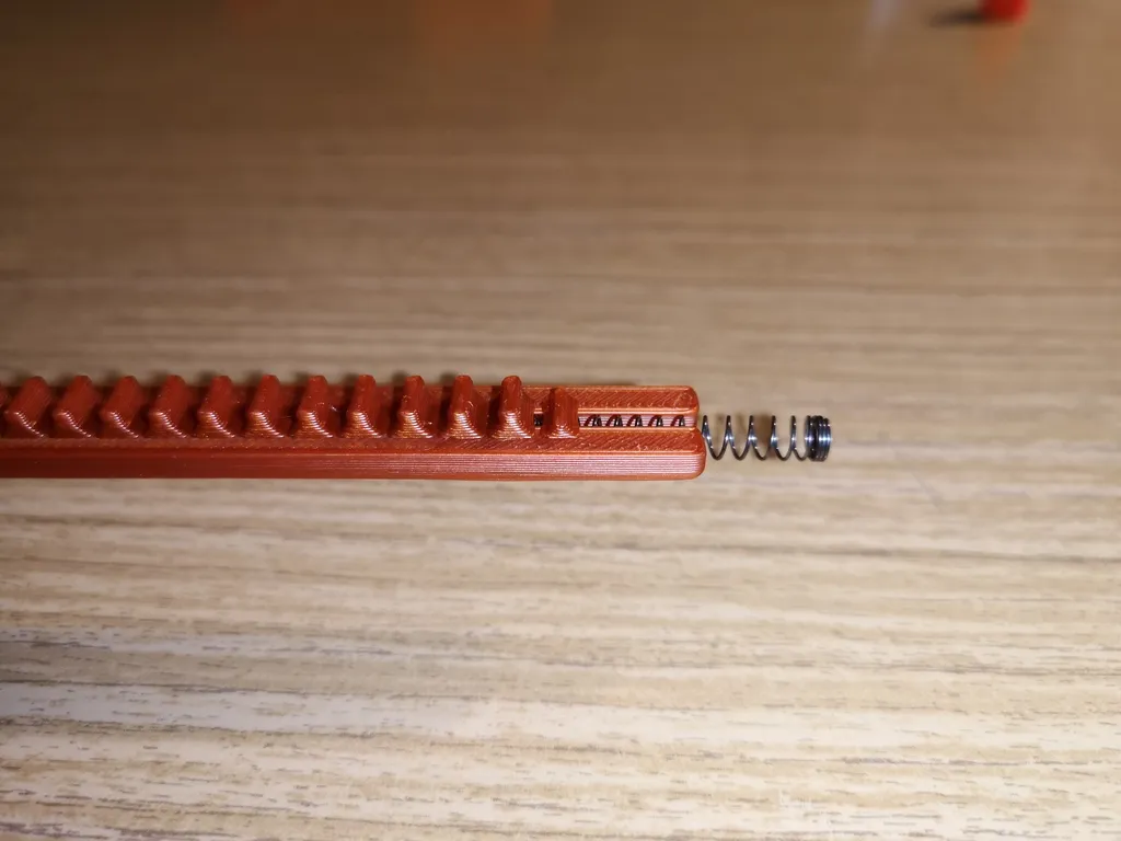 Phần đường ray được sửa đổi này được trang bị một lò xo ở đầu dưới và một cổ dài hơn ở đầu trên. Lò xo giữ đường ray ở vị trí làm việc với các răng của nó gắn vào nhau nhưng cũng cho phép nó di chuyển thêm nơi mà khu vực không có răng của nó đứng đối diện với bánh răng và cho phép nó quay tự do. Hãy xem video với đường ray này hoạt động. https://youtu.be/Gp9KecYa2sk