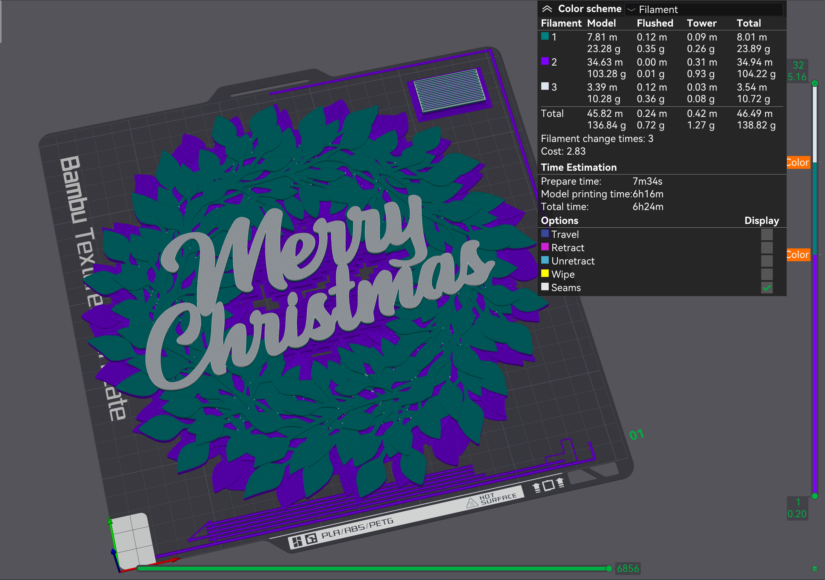 In vòng hoa Giáng Sinh cỡ lớn có chữ trang trí. File 3mf có sẵn cho Bambu X1, hỗ trợ in đa màu và tự động tạo support.