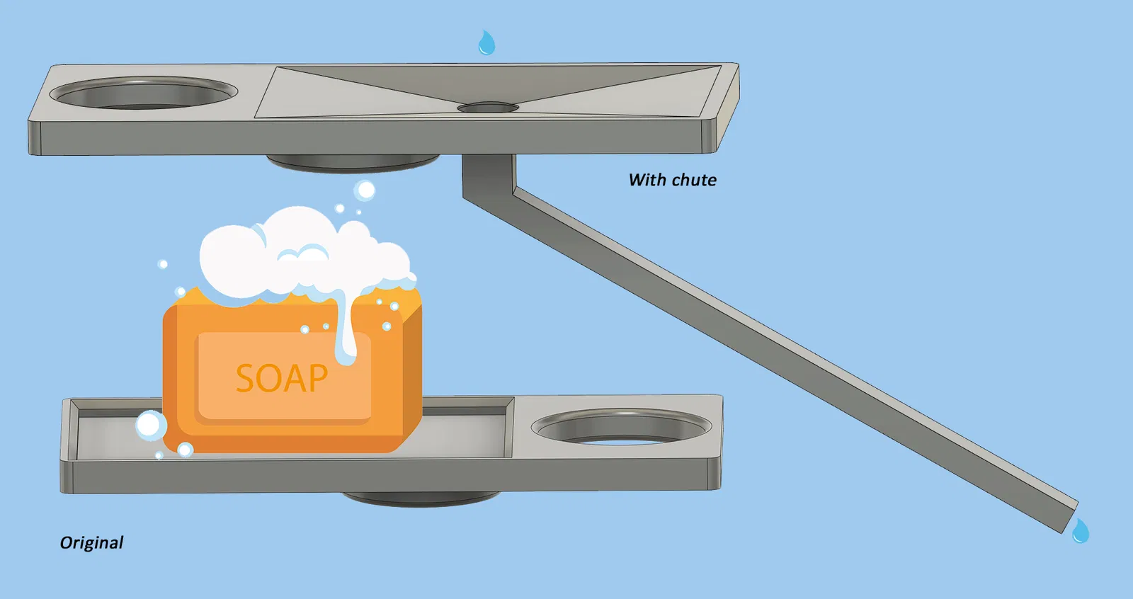 Cải tiến đế cũ trên tường phòng tắm thành đế đựng xà bông và ly tiện lợi. Thiết kế parametric cho phép tùy chỉnh dễ dàng. Phiên bản mới có máng thoát nước xoay 360° giúp xà bông luôn khô ráo.