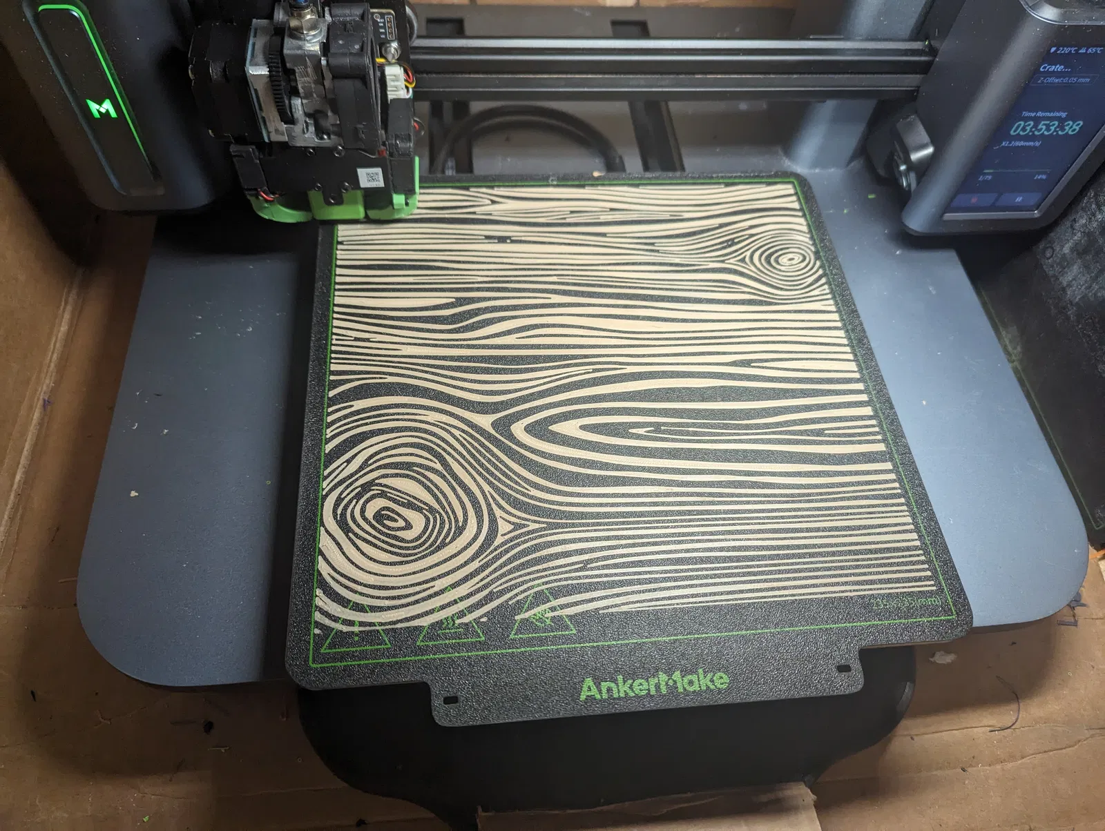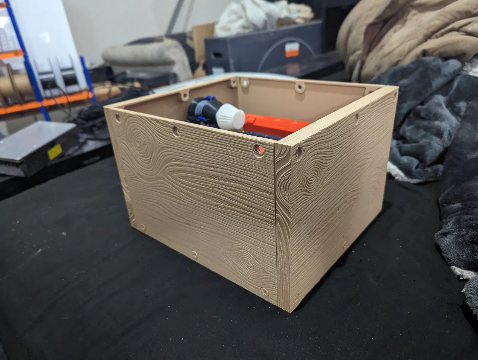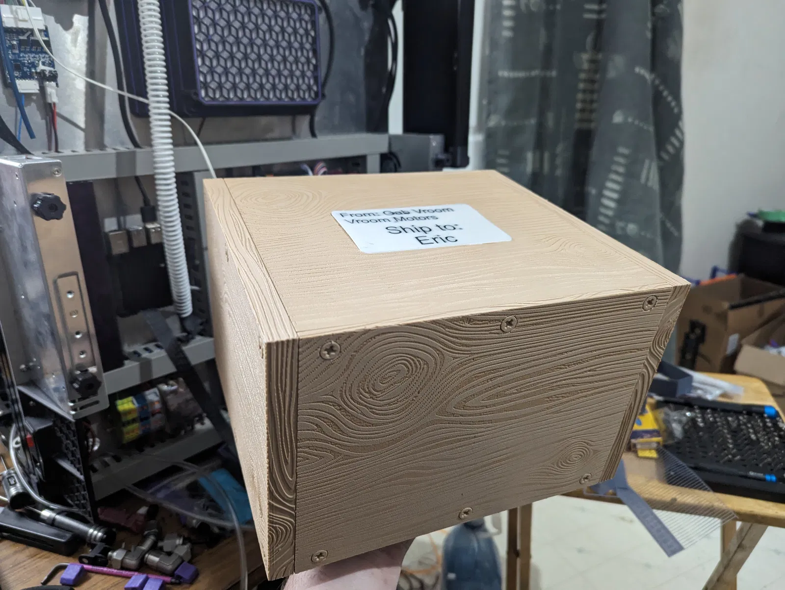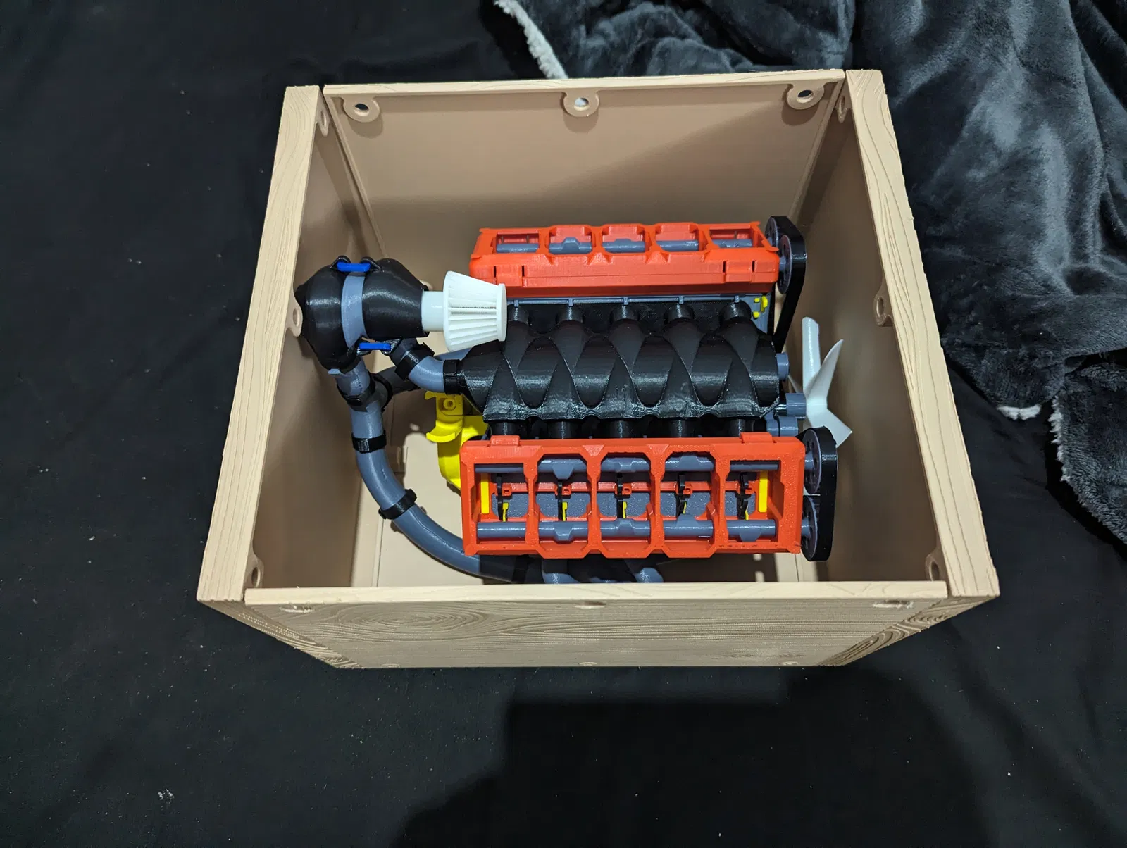 Câu chuyện phía sau: Tôi đã in một bộ động cơ chức năng và muốn tạo một chiếc thùng để có chủ đề “crate engine” làm quà tặng, vì vậy tôi tìm thấy một vân gỗ miễn phí và sử dụng nó trên các mặt để tạo ra vẻ ngoài bằng gỗ. Chiếc thùng được tạo mô hình để vừa với động cơ với một chút không gian để di chuyển, và sau đó tôi đã sửa đổi nó một chút để giữ động cơ cố định.