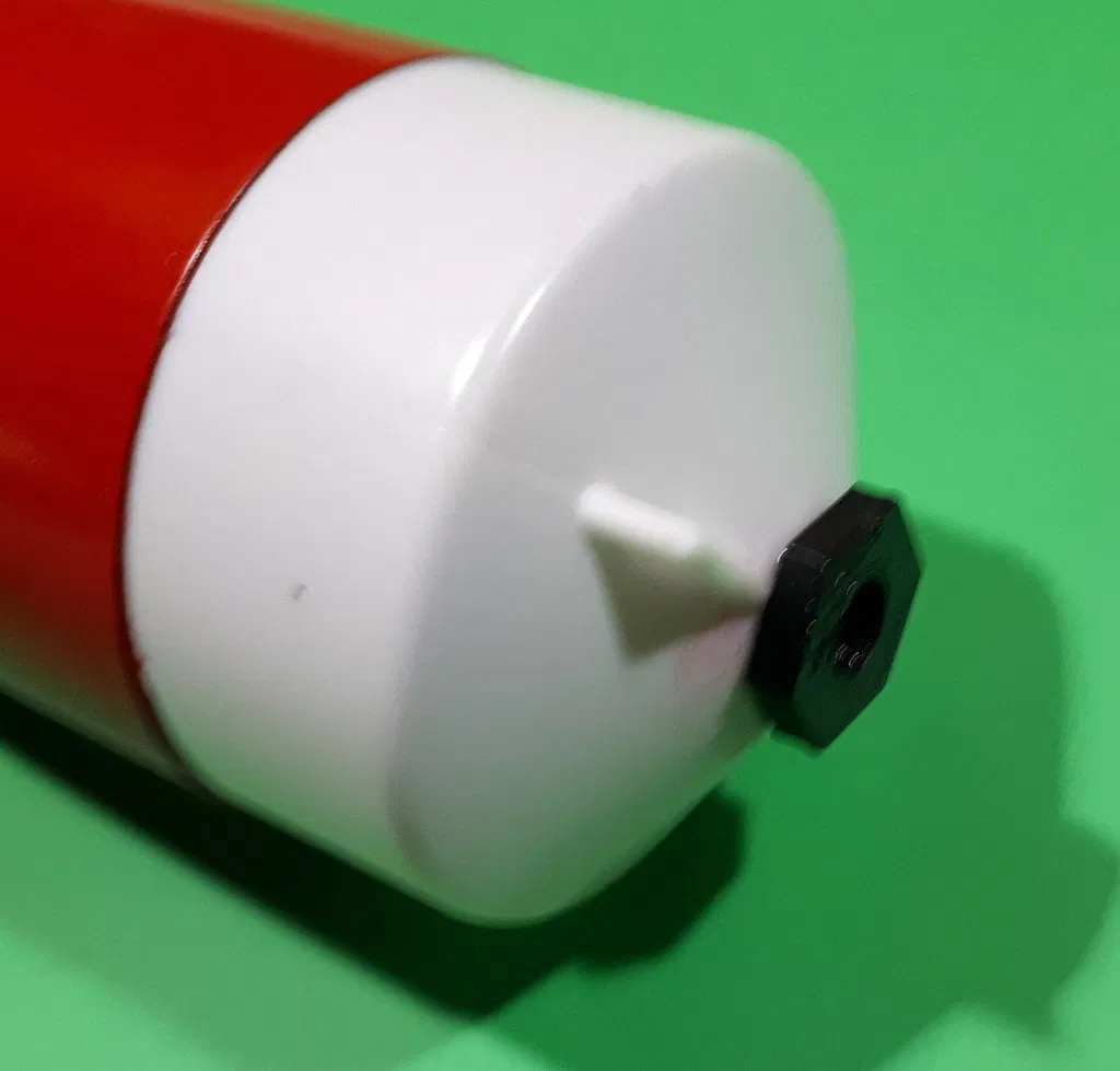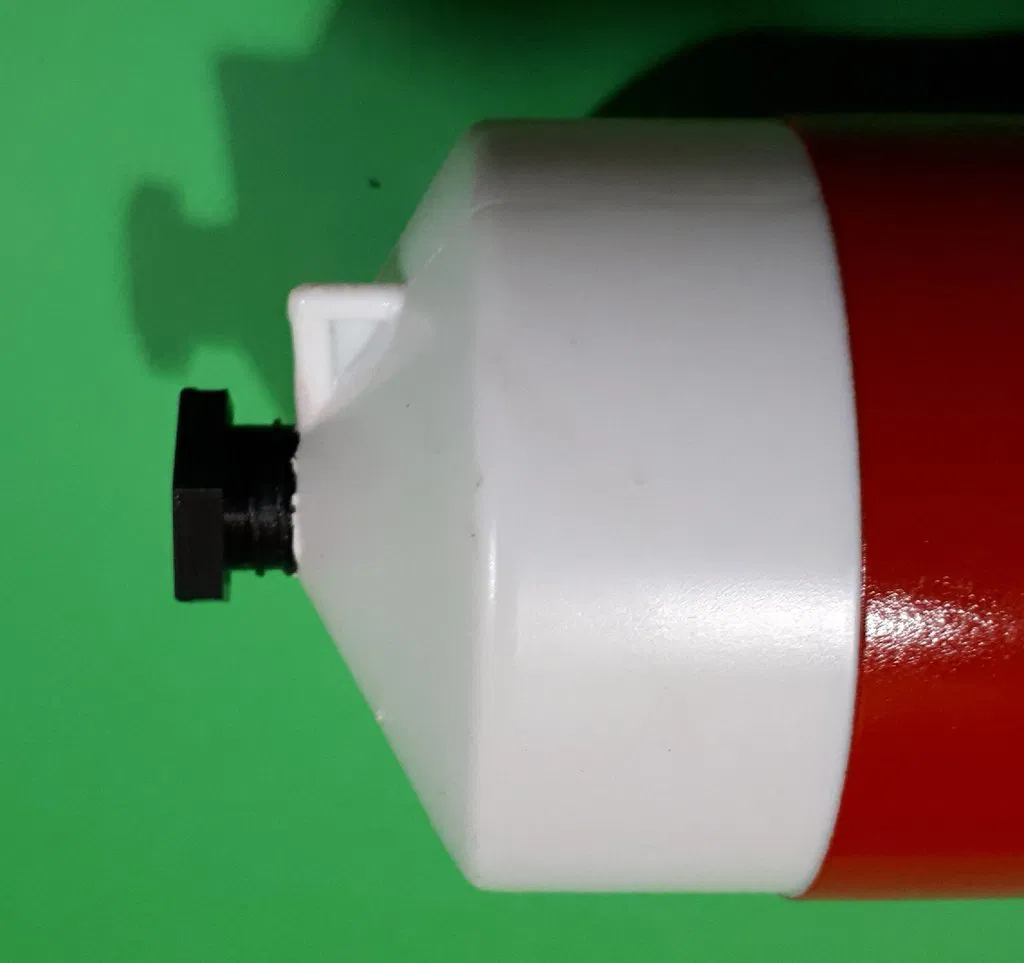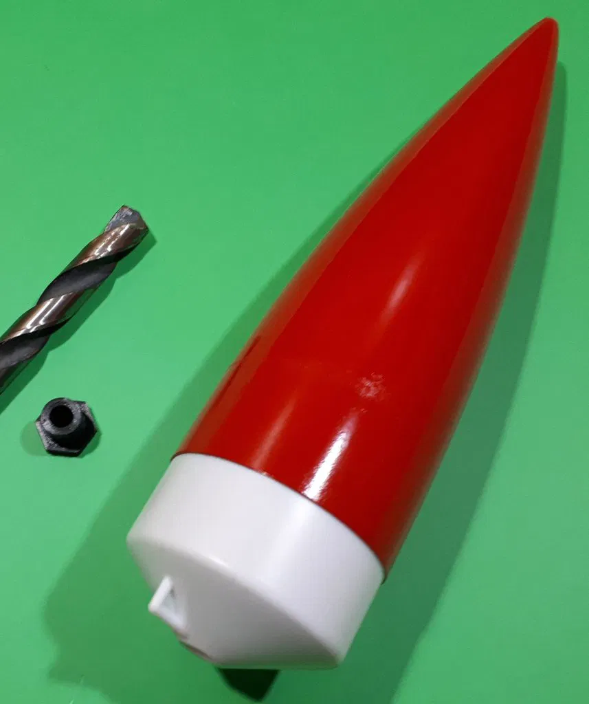 Cái đai ốc nhỏ này cho phép bạn điều chỉnh trọng lượng của chóp mũi BT-80. Bạn có thể muốn điều này để điều chỉnh độ ổn định, hoặc để giới hạn độ cao khi phóng từ sân nhỏ hơn. Để thực hiện sửa đổi này, trước tiên hãy dùng mũi khoan 1/2 inch để khoét rộng lỗ dưới chóp mũi. Sau đó, vặn chặt đai ốc vào (vừa khít nhưng vẫn nên dùng keo cho ren ngoài). Một khi đã vào vị trí, bạn có thể vặn bu lông M8 vào lỗ ren trong của đai ốc. Đó có thể là trọng lượng, hoặc bạn có thể thêm vòng đệm để tăng trọng lượng.