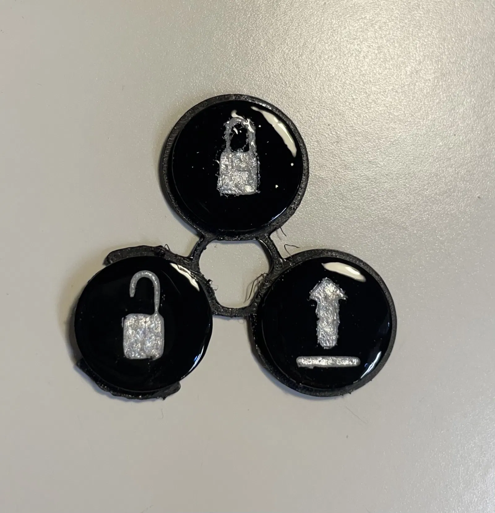 Đây là một mẫu 3D được tạo ra để sửa các nút bấm trên remote xe hơi thông minh, phòng trường hợp chúng bị mòn. Một phần lớp lót cao su bên trong remote phải được cạo bỏ để nút bấm mới có thể lắp vừa. Tôi đã in chúng bằng nhựa PETG, úp mặt có biểu tượng lên trên và bật chế độ hỗ trợ (supports). In ở độ cao lớp là 0.16mm, có áp dụng bề mặt trên cùng (ironing). Sau đó, tôi đã sơn các biểu tượng và chà nhám mặt nút, tiếp theo là phủ vài lớp sơn móng tay trong suốt. Dĩ nhiên, đây chỉ là sở thích cá nhân của tôi.