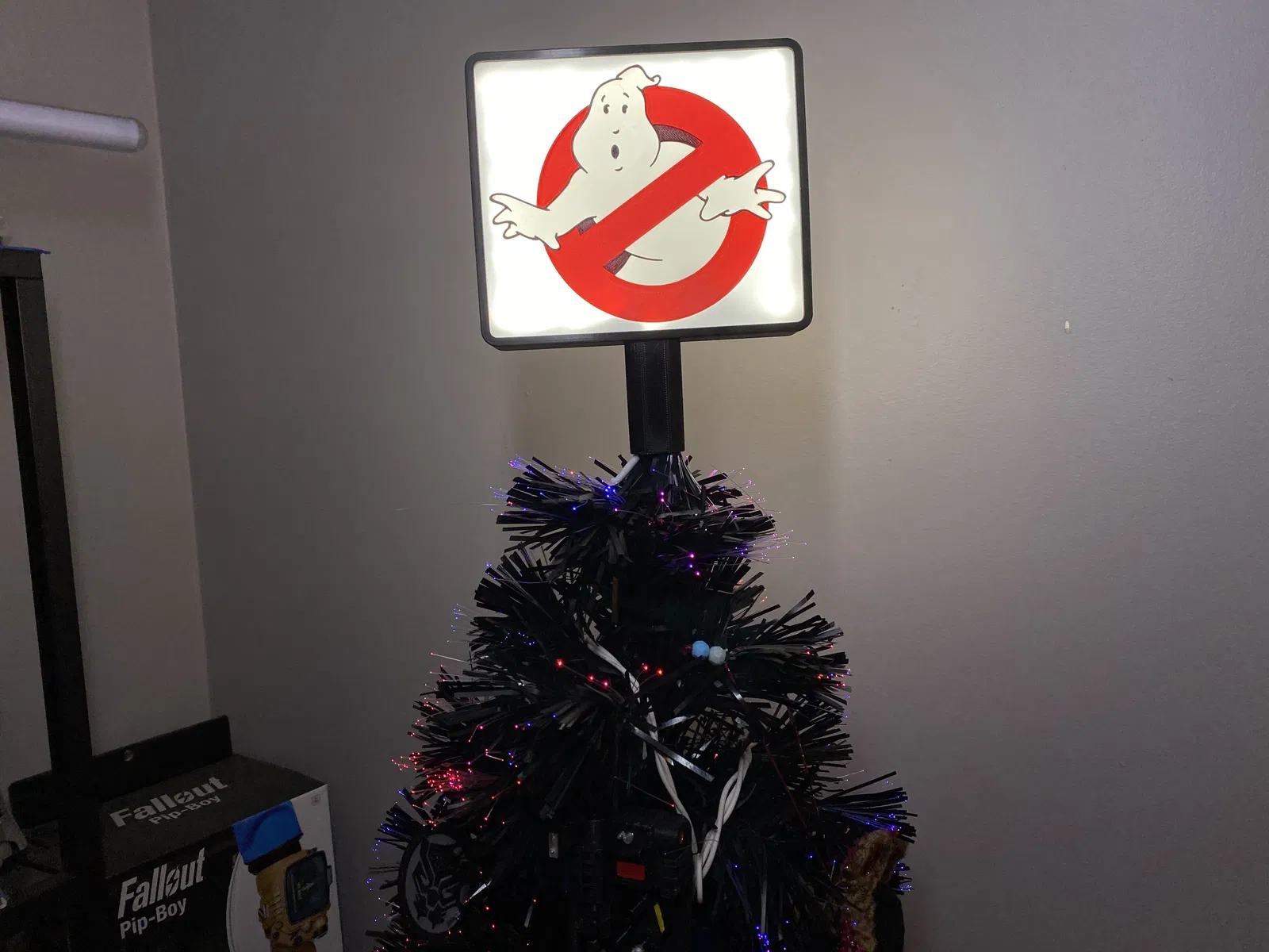 Phiên bản cập nhật của mẫu biển hiệu Ghostbusters phát sáng nhà mình để trang trí cây thông Noel.