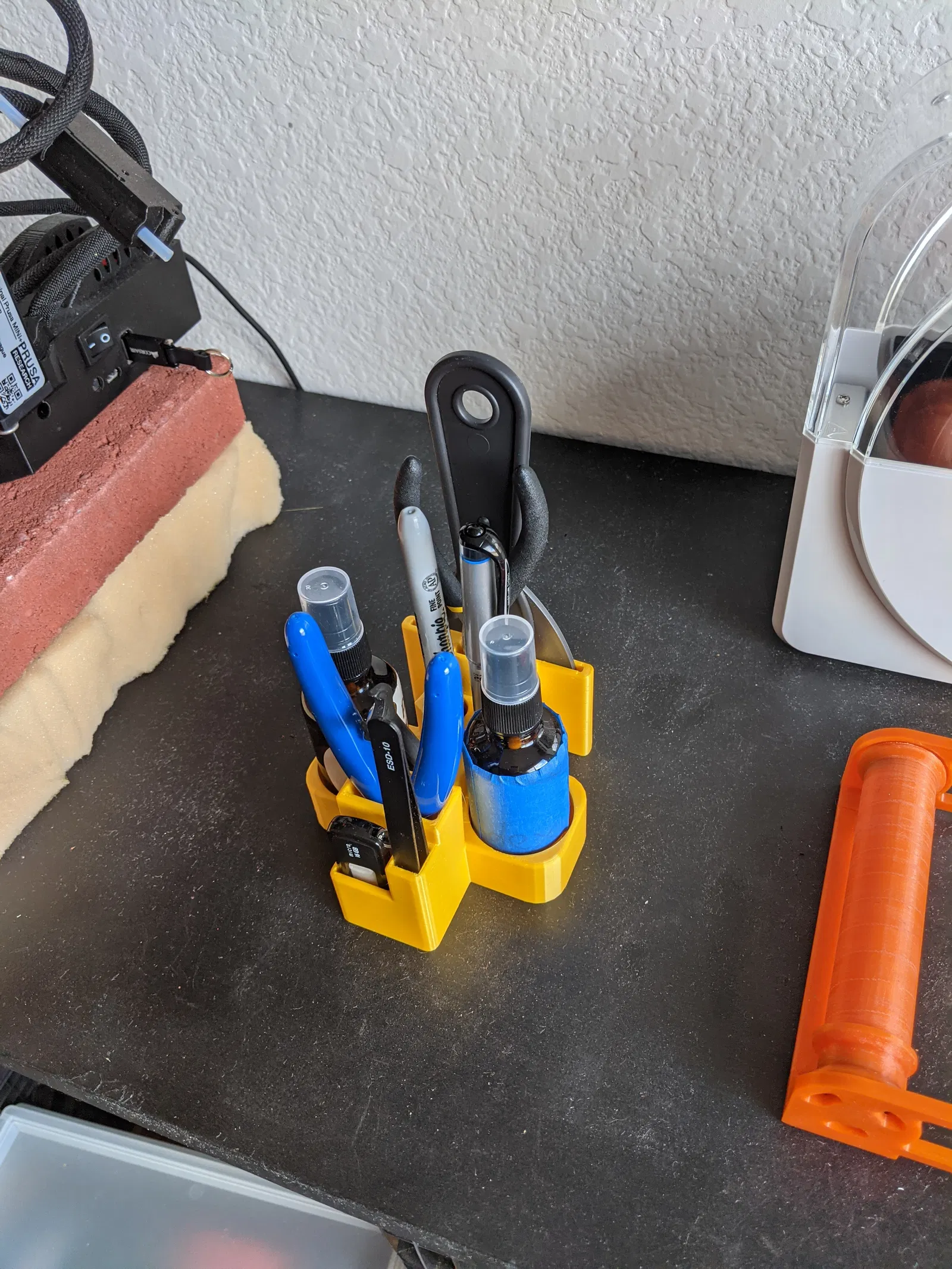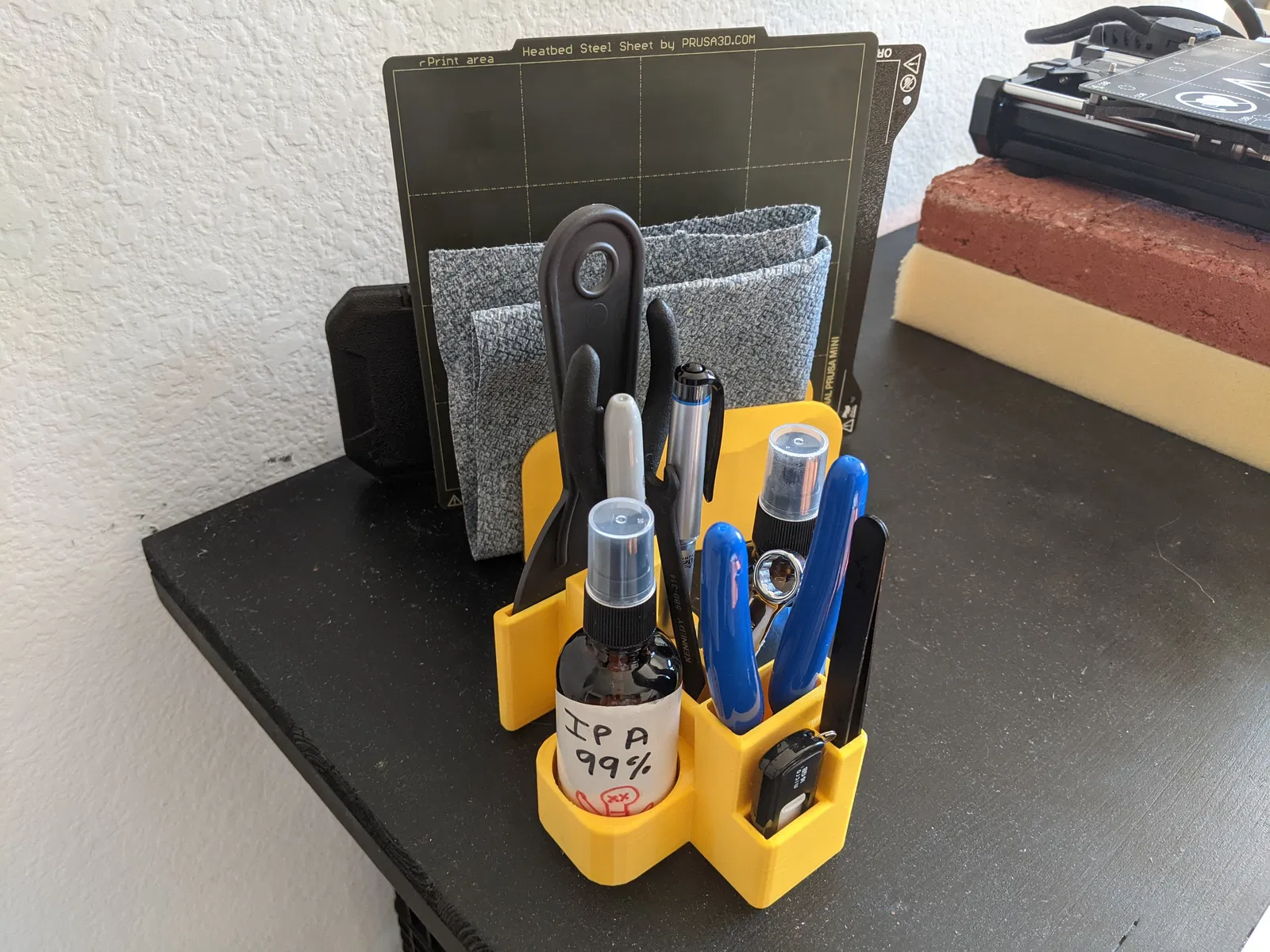 Mệt mỏi vì tìm hoài không thấy dụng cụ 3D, tôi đã làm cái đế này để giữ mọi thứ. Nó có các khe cắm cho nhiều loại dụng cụ khác nhau như kềm, tua vít, chai xịt, USB, và cả nơi để khăn lau, thép và thước kẹp. Đế này gồm 2 phần, phù hợp với khay Prusa MINI+.