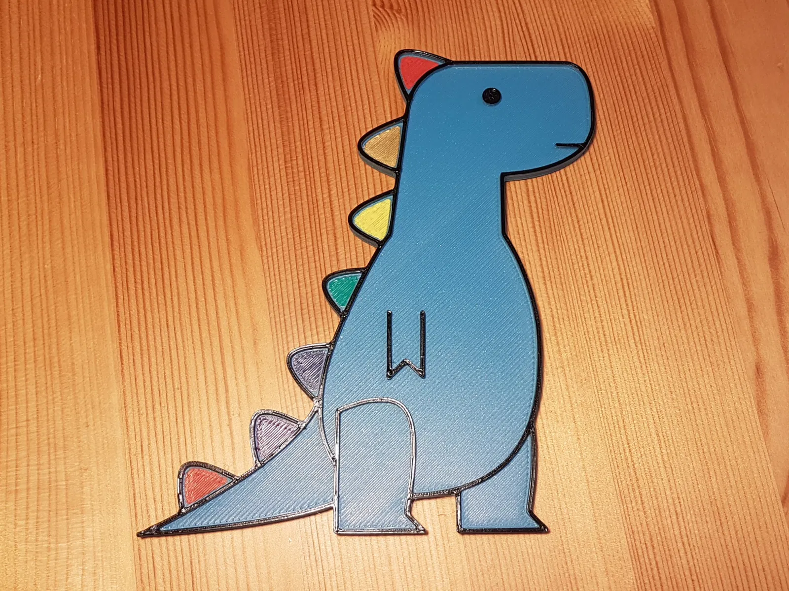 Bạn này là con khủng long T-Rex được làm thủ công, có màu sắc sặc sỡ. File STL được tạo ra từ việc vector hóa ảnh PNG, xử lý bằng Inkscape và Blender. Thích hợp làm đồ trang trí treo tường hoặc làm quà tặng.