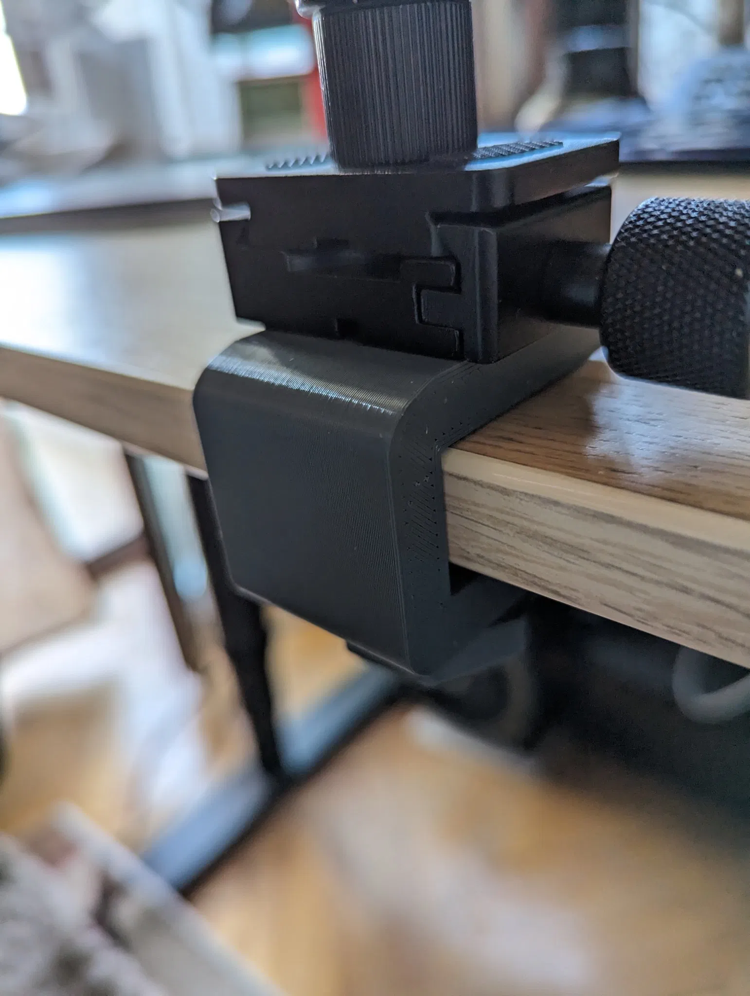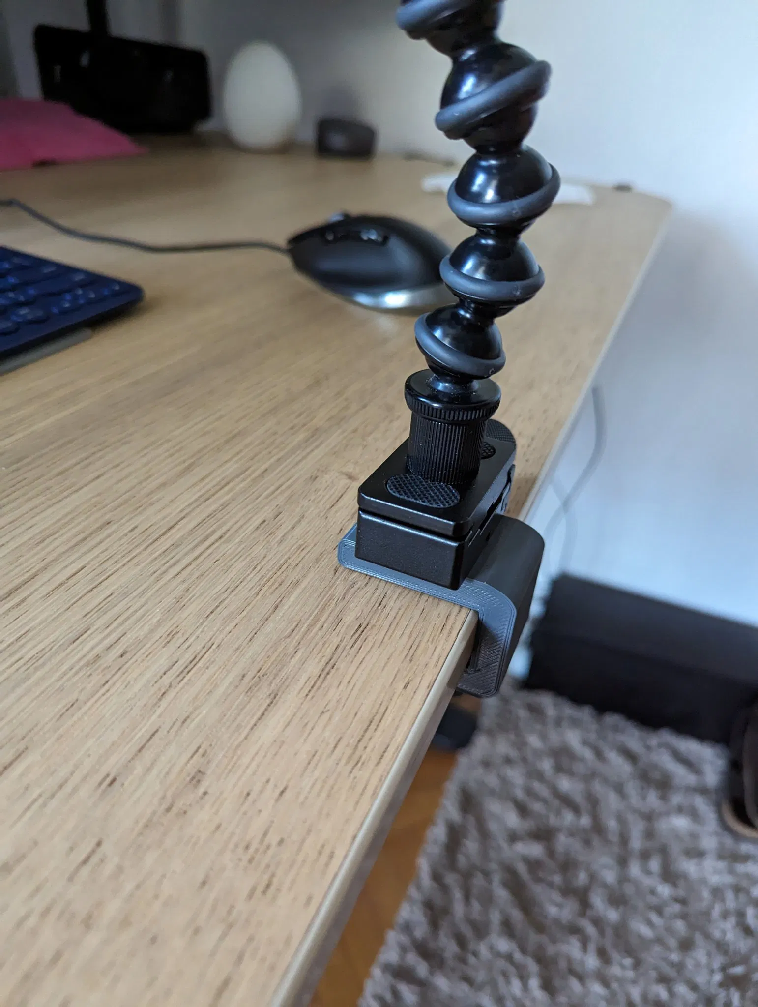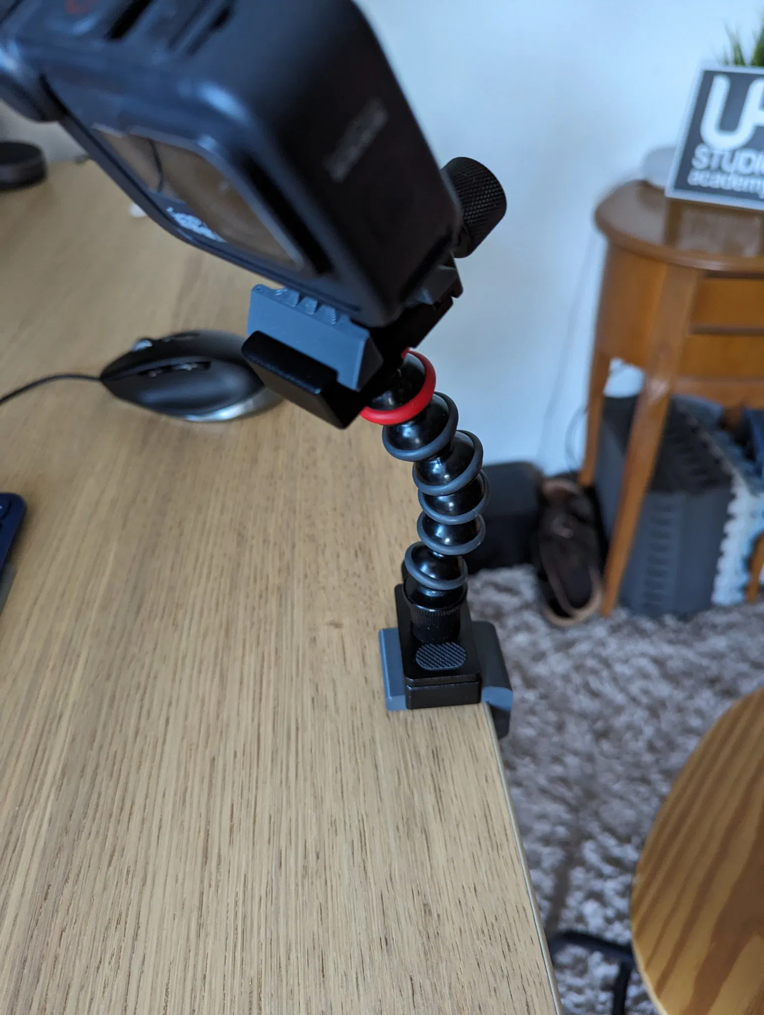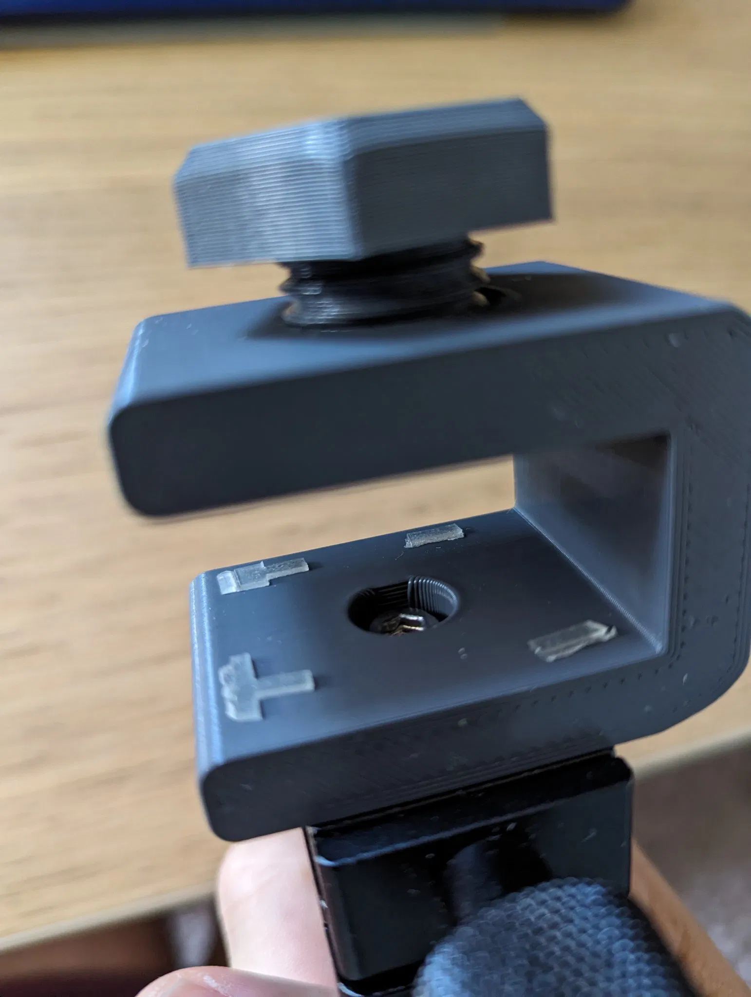 Tôi có một vài giá đỡ máy ảnh rất chắc chắn, nhưng chúng quá cồng kềnh, vì vậy tôi đã tìm thấy một mô hình kẹp đẹp và đã sửa đổi nó trong Blender để hoạt động như một giá đỡ phụ kiện máy ảnh.