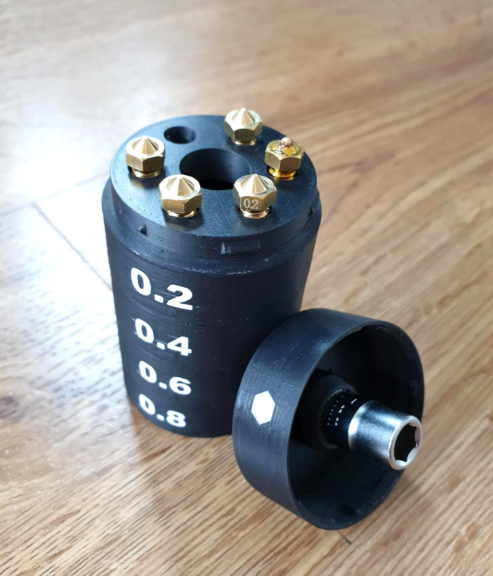 Hộp đựng đầu phun dạng module, dễ in. Mỗi phân đoạn có thể chứa tối đa 6 đầu phun. Các bộ phận được in bằng ASA, không cần hỗ trợ. Có thể tùy chỉnh nhãn THÉP hoặc dung tích cho nhiều đường kính đầu phun.