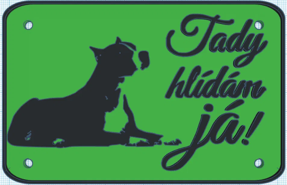 Biển báo "Pozor pes" với dòng chữ "Tady hlídám já" (Tạm dịch: "Chỗ này có tui canh giữ"). Thích hợp cho những ai yêu chó và muốn có một tấm biển độc đáo cho ngôi nhà của mình. Chất liệu PLA, định dạng STL để in 3D.