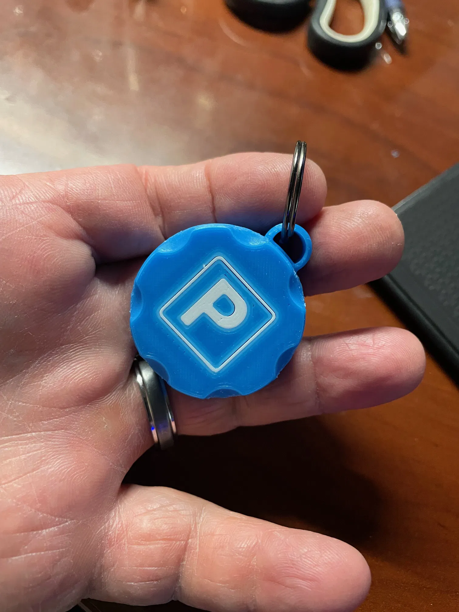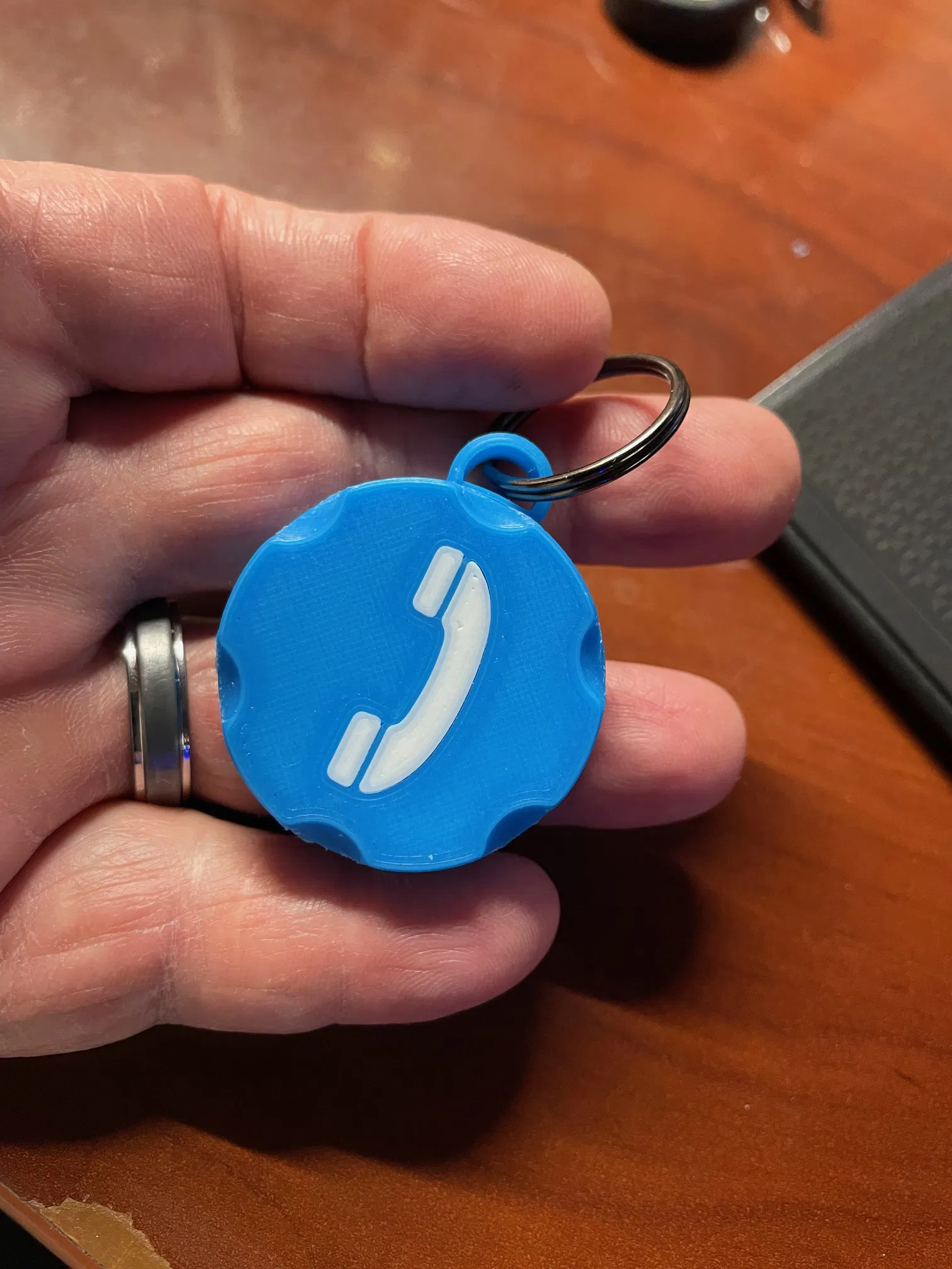 Trên cái móc khóa có hình điện thoại với bãi đậu xe.