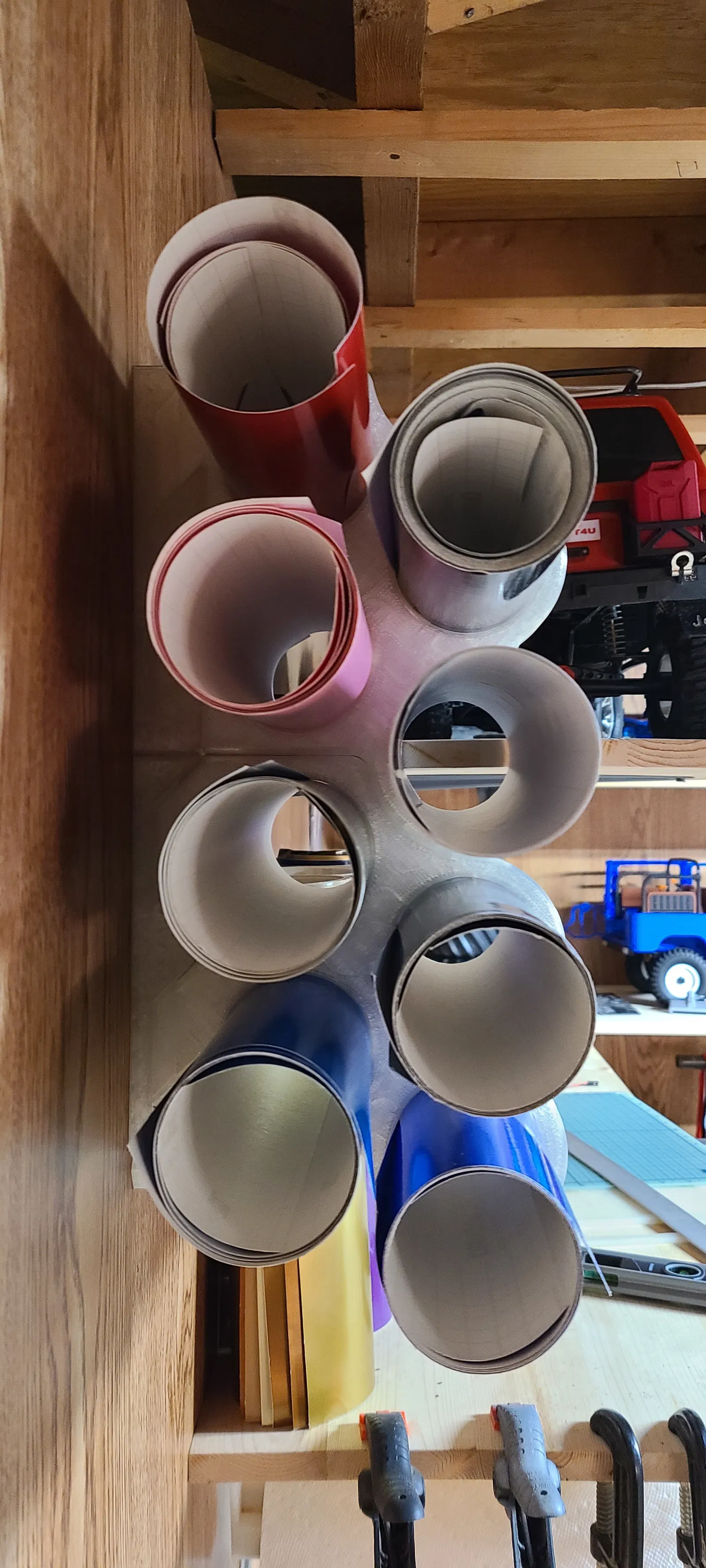 Một kệ đựng cuộn vinyl đơn giản giúp sắp xếp các cuộn vinyl thủ công của bạn một cách gọn gàng. Kệ in theo từng phần và có đế treo tường kiểu "French cleat" để dễ dàng lắp đặt và sử dụng.