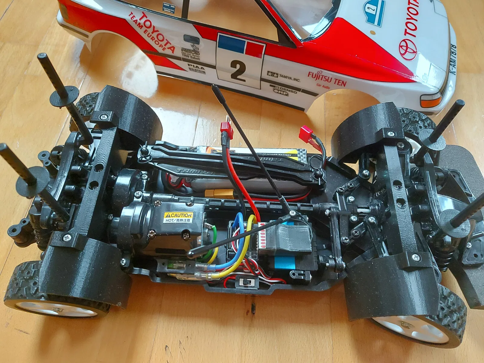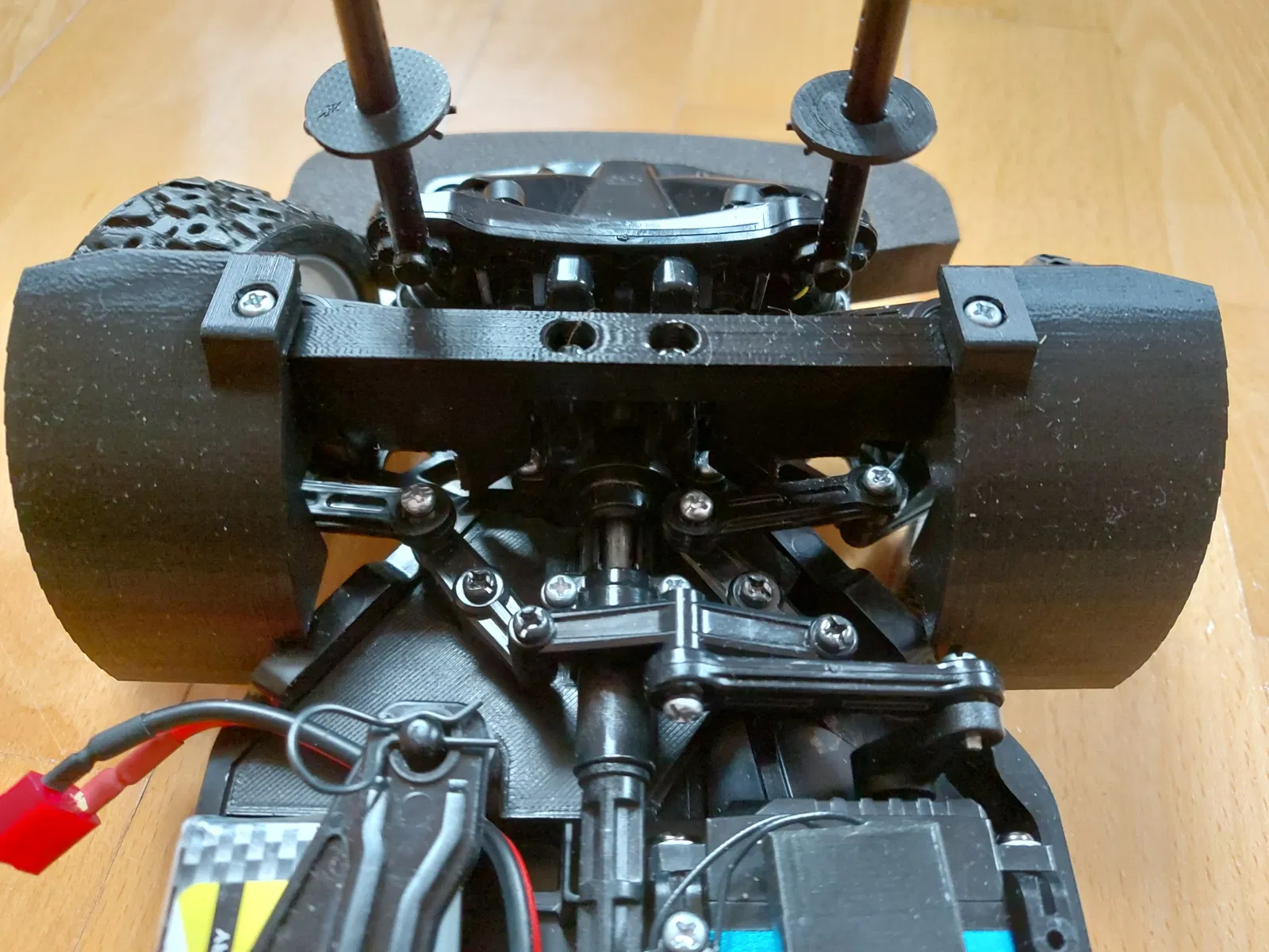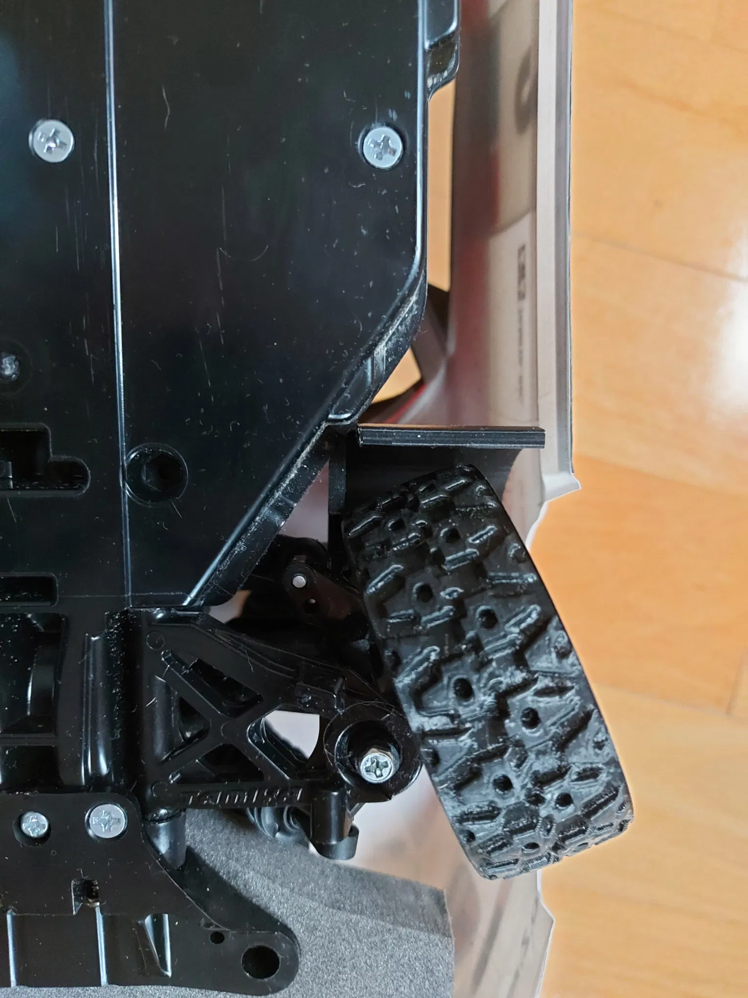 Lấy cảm hứng từ bản remix này, tui đã tự làm mấy cái dè chắn bùn, đảm bảo là cạ bánh xe không có cửa luôn. Chiếc tt02 của tui đã được độ lại hệ thống treo để đi êm hơn, nên tui cần nhiều khoảng trống hơn bình thường. (Mà chắc là xài treo zin cũng được luôn á). Thiết kế dè này xài được với bánh xe đường kính lên tới 68mm, và giảm đáng kể lượng bùn đất bay vào trong khung xe.