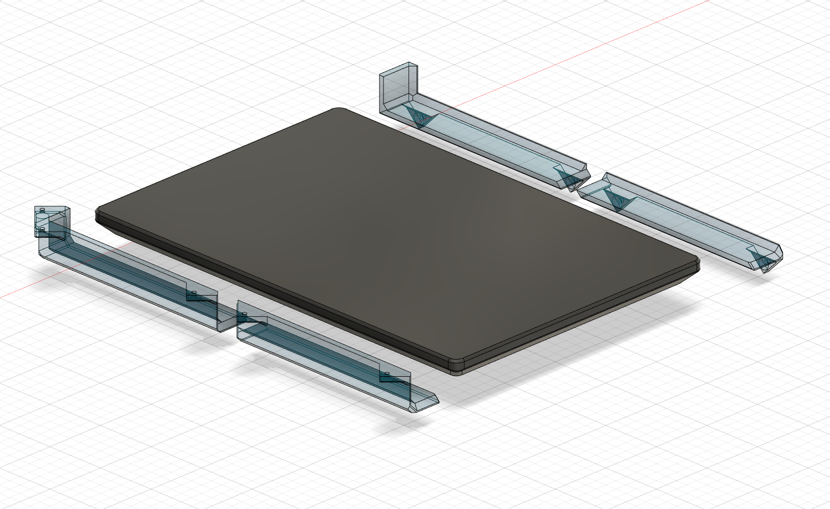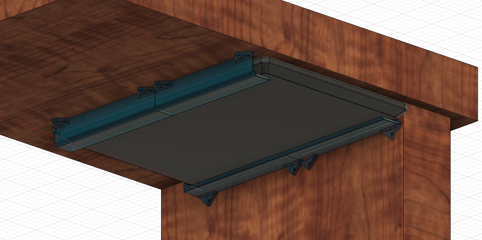 - Bắt đầu từ bộ phận góc và đặt khối lắp đặt giữa bộ phận đỡ laptop và mặt bàn để nó cân bằng với mặt bàn (như trong hình). LƯU Ý: để đủ khoảng trống cho dây cáp!