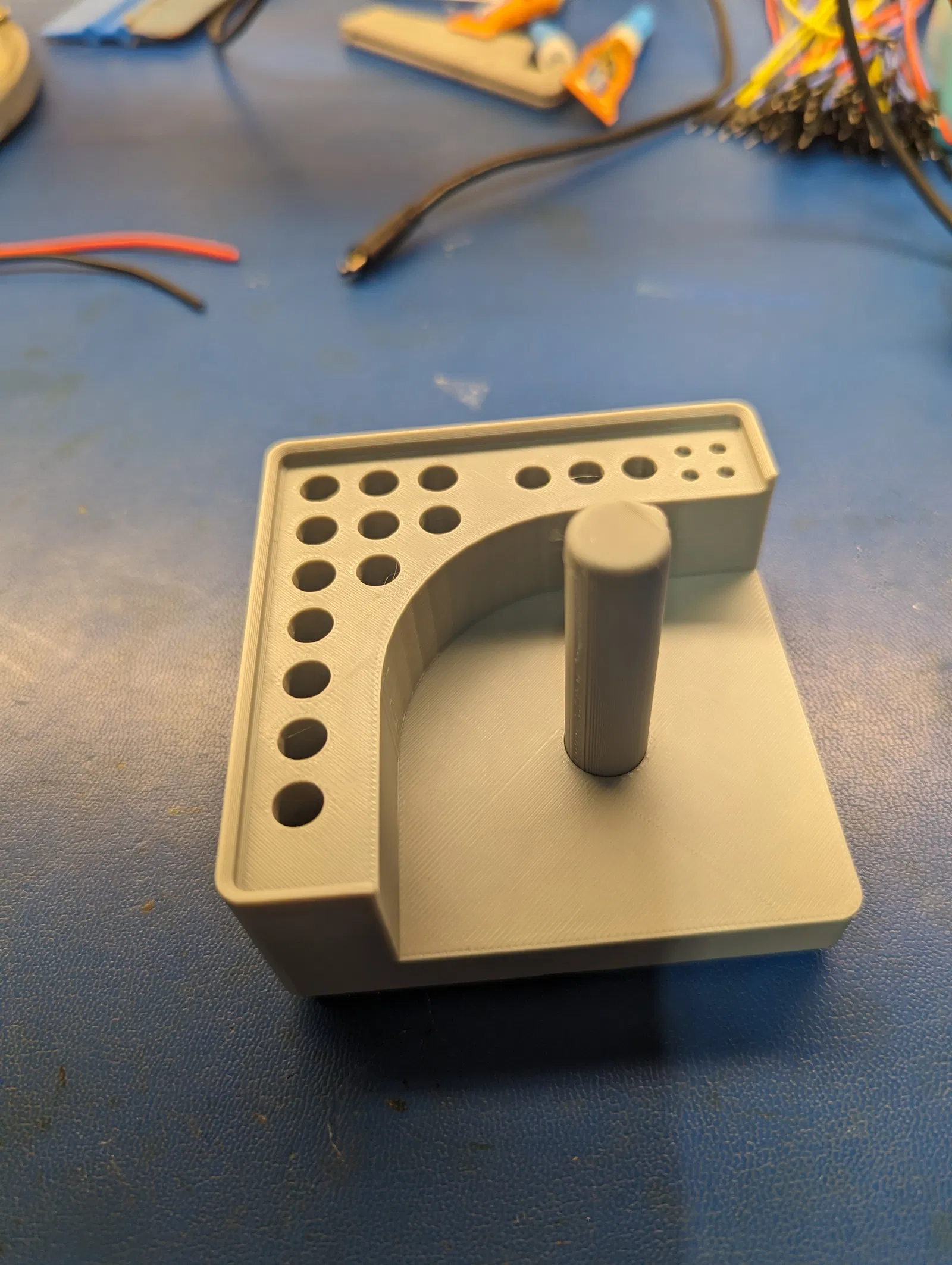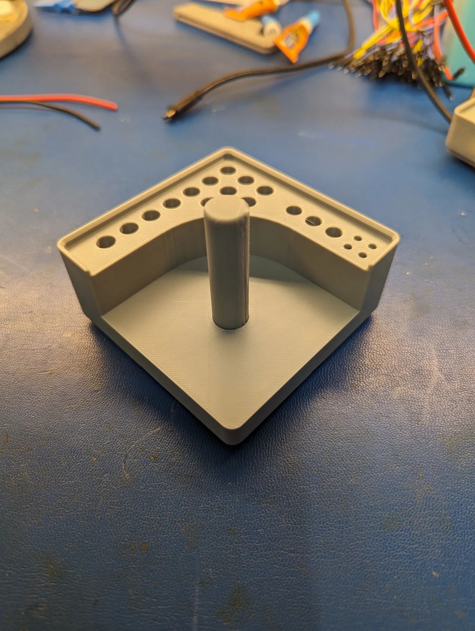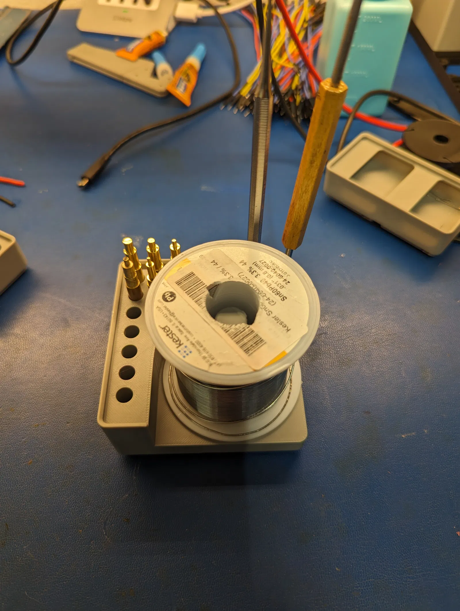 Kệ Gridfinity 2x2x5 đựng cuộn solder 1lb, mũi hàn Hakko FX888 và các loại que gắp. Chỗ để mũi hàn hơi chật, sẽ chỉnh lại sau.