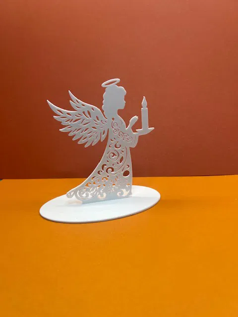 Mô hình Thiên Thần Giáng Sinh có nến, có thể để bàn hoặc treo. Hướng dẫn in chi tiết với cài đặt cho PETG và gợi ý PLA, nhấn mạnh việc in chậm để có chất lượng tốt nhất. Thông số kỹ thuật: đầu phun 0.4mm, chiều cao lớp 0.2, infill 100%.