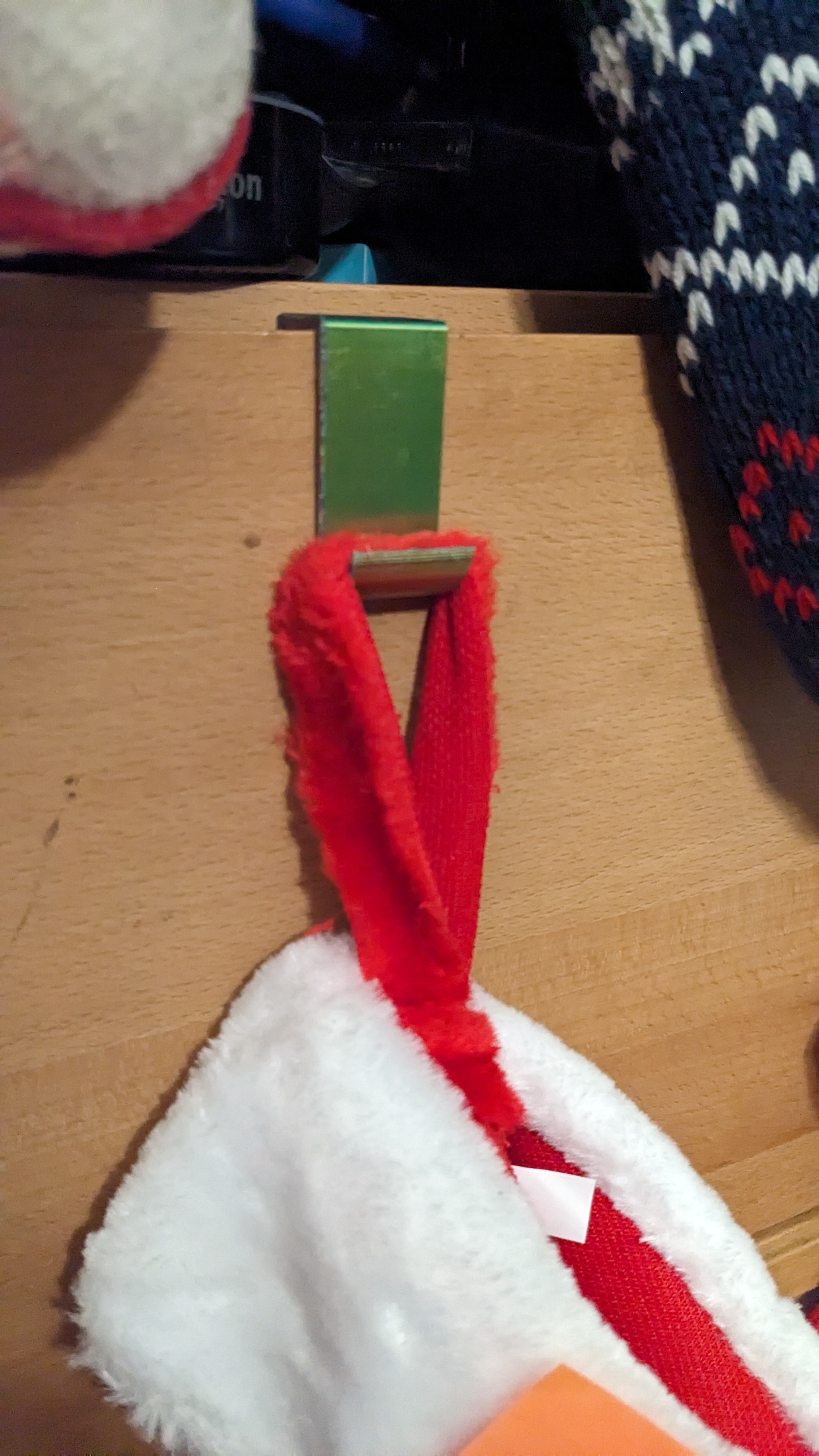 Chỉ là một cái kẹp đơn giản để gắn lên mặt ngăn kéo. Sản phẩm này rất hữu ích để bạn có thể treo những chiếc vớ, quà tặng nhỏ trong dịp Giáng Sinh mà không cần phải đóng đinh hay khoan lỗ.