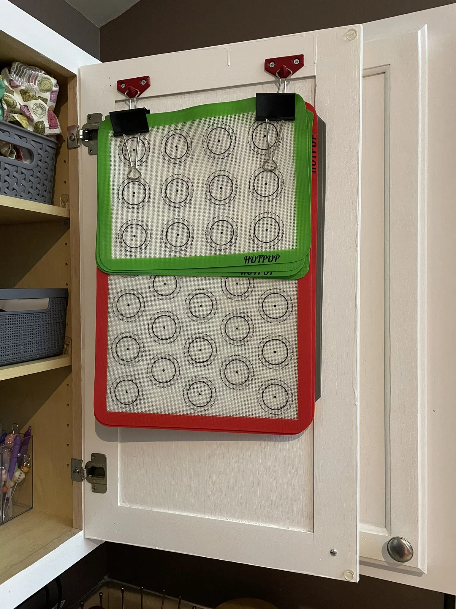 Cái đế này bạn có thể bắt vít vào bề mặt gỗ để tạo điểm treo cho kẹp giấy và các vật dụng có móc khác. Nó giúp treo mấy tấm lót bánh silicon đứng thẳng trong tủ cho gọn gàng. Cần kẹp giấy loại bự nha.